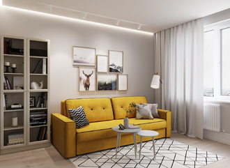 Спинка, выполненная в обивочной ткани, позволяет ставить диван в центре комнаты и зонировать пространство.