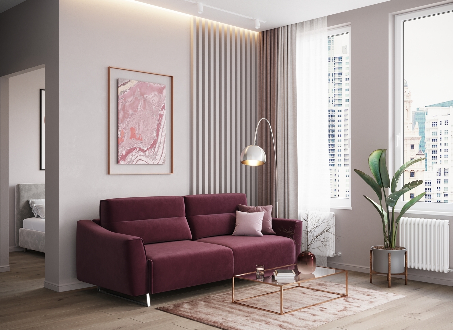 Декоративный кант, частично проходящий по элементам дивана, подчеркивает роскошь форм, усиливая эстетику образа.