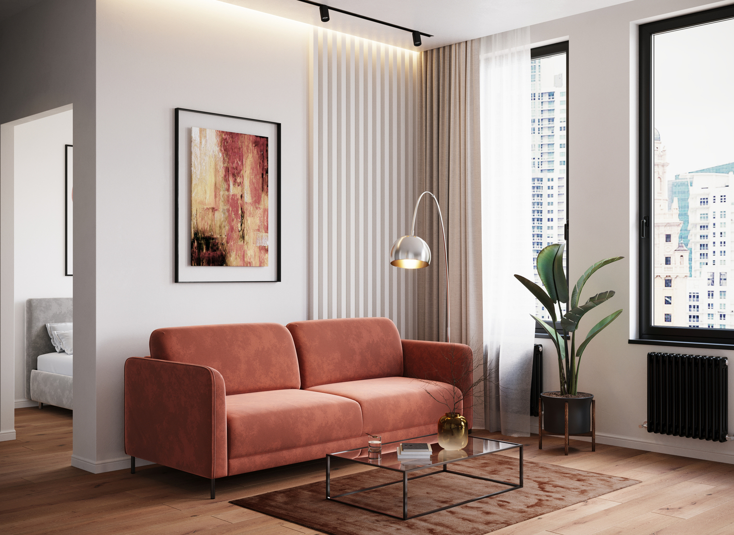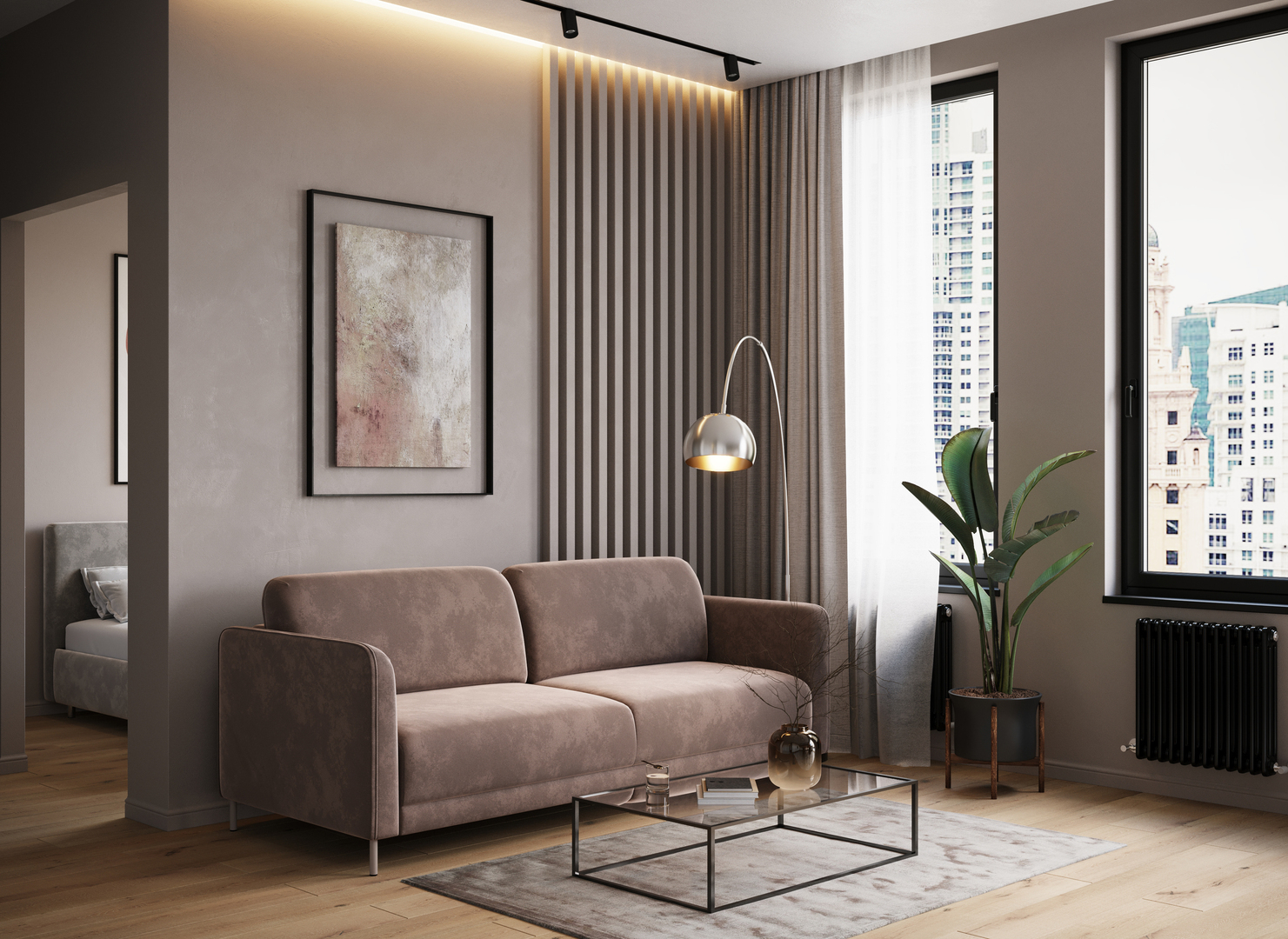 Спинка, выполненная в обивочной ткани, позволяет ставить диван в центре комнаты и зонировать пространство. По замыслу дизайнеров-конструкторов нижняя линия спинки дивана и подлокотники находятся на одном уровне. Уборка становится легкой, так как нет никаких препятствий для прохождения робота-пылесоса.