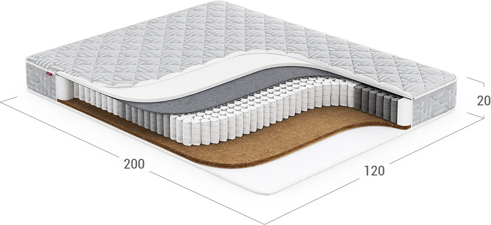 Матрас с простым и понятным составом материалов имеет ярко выраженное различие жесткости сторон для легкого выбора. Он обеспечивает улучшенную поддержку позвоночника за счет увеличенной жесткости слоев.
