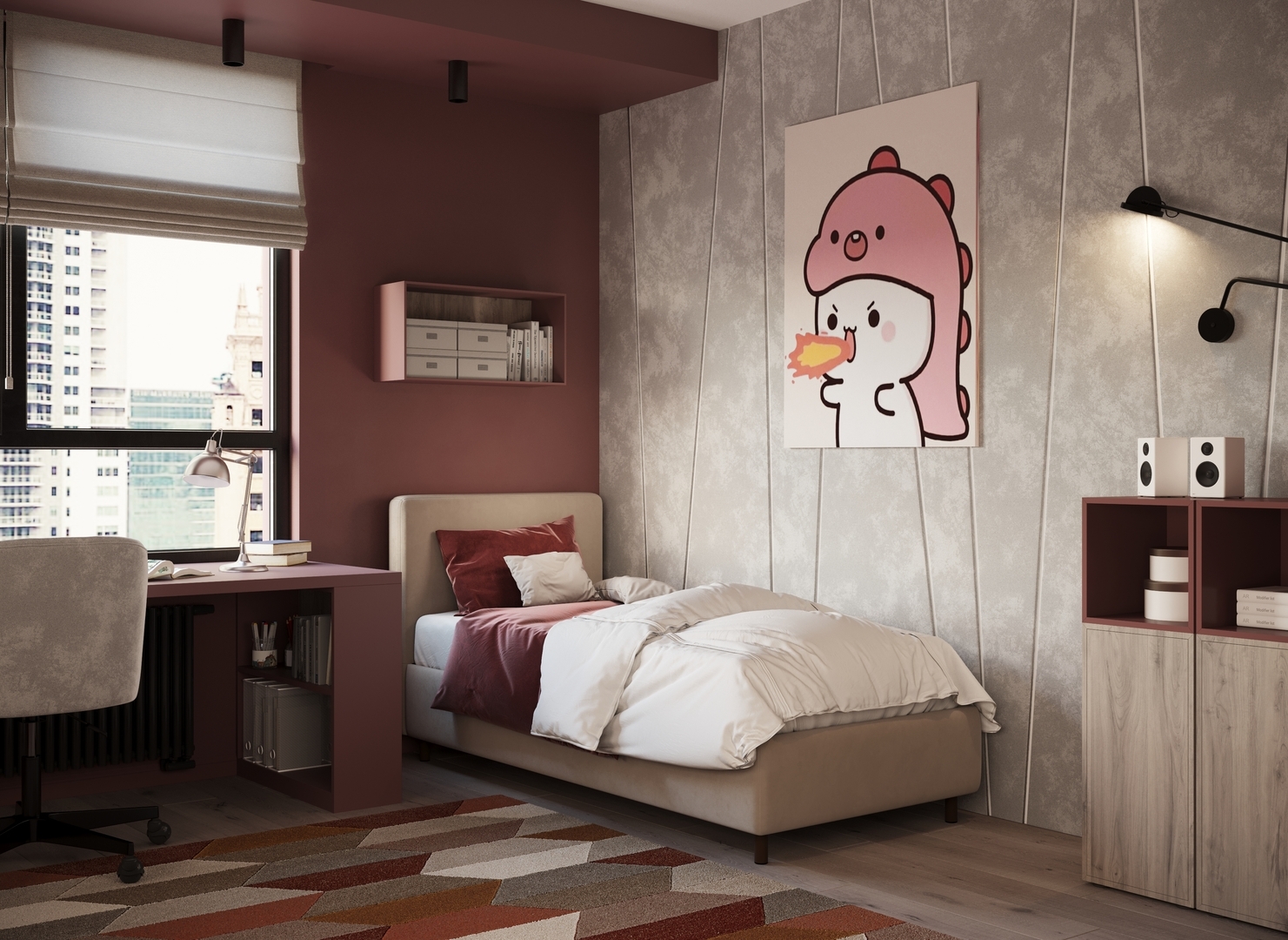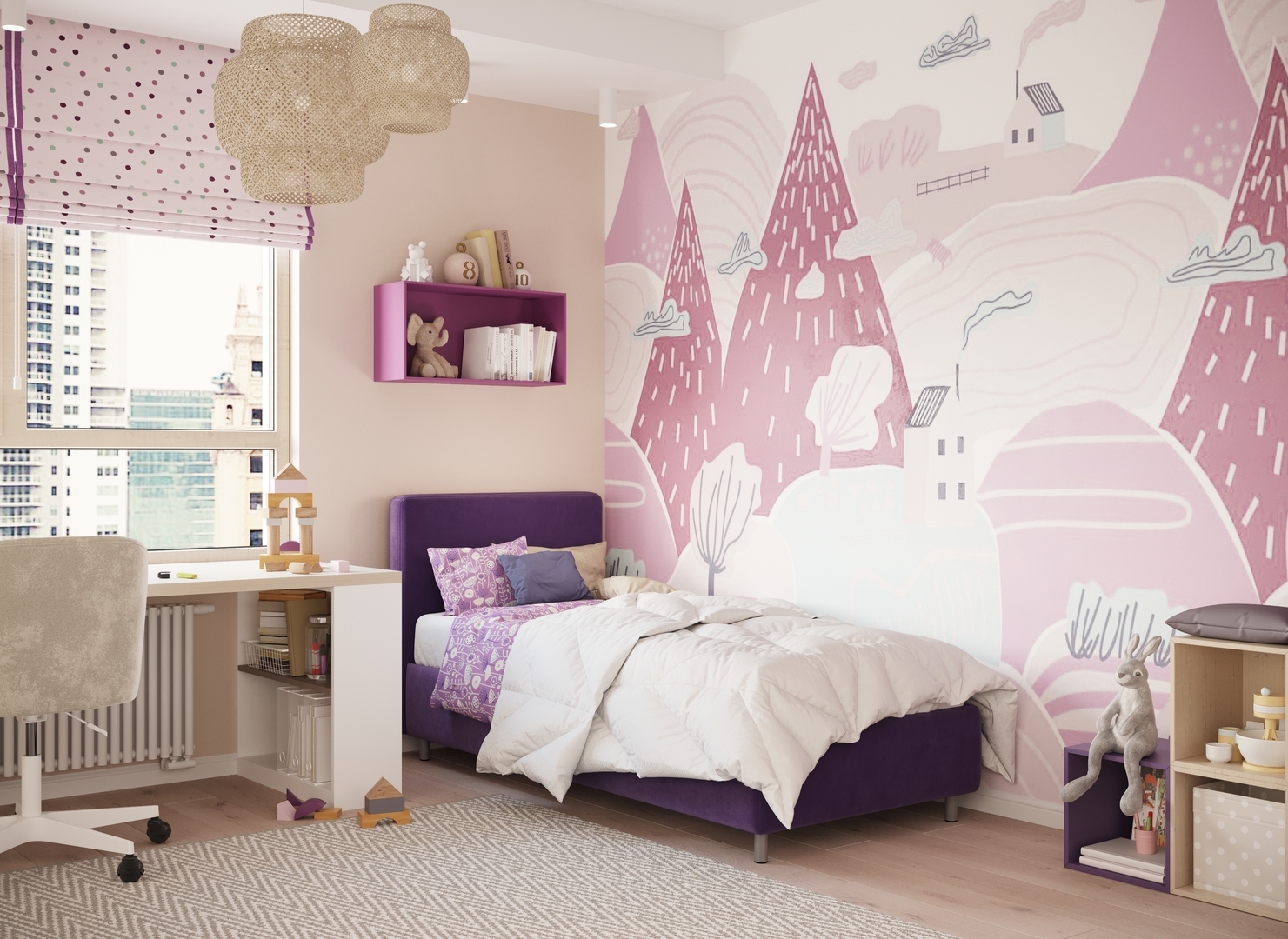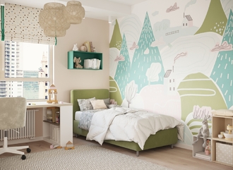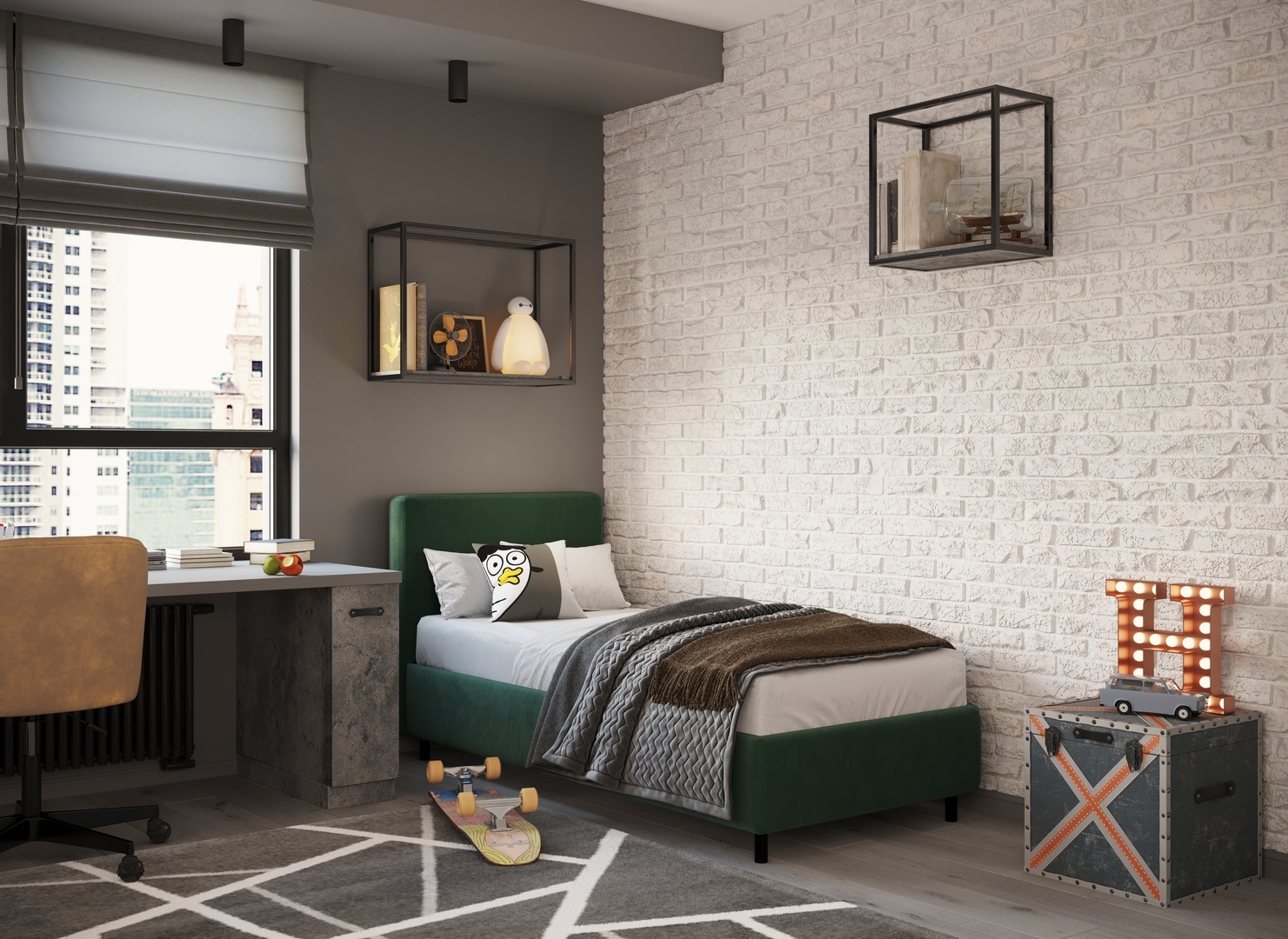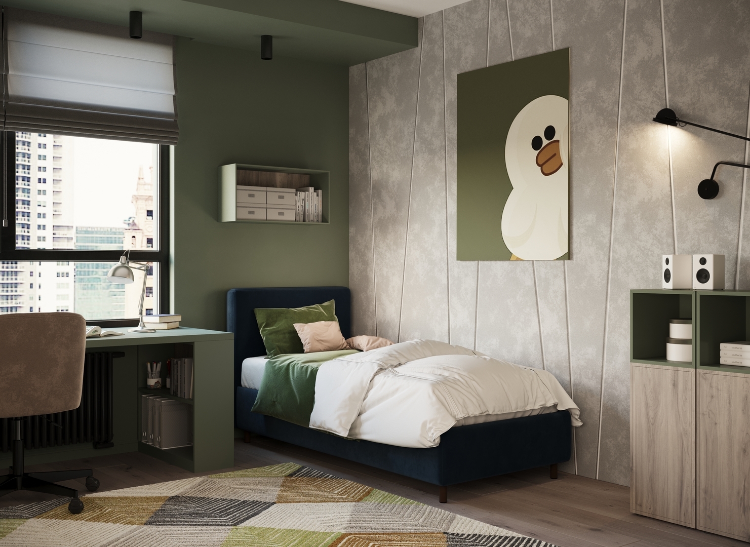 Обратная сторона изголовья выполнена в мебельной ткани и позволяет ставить кровать в центре комнаты для зонирования пространства.
