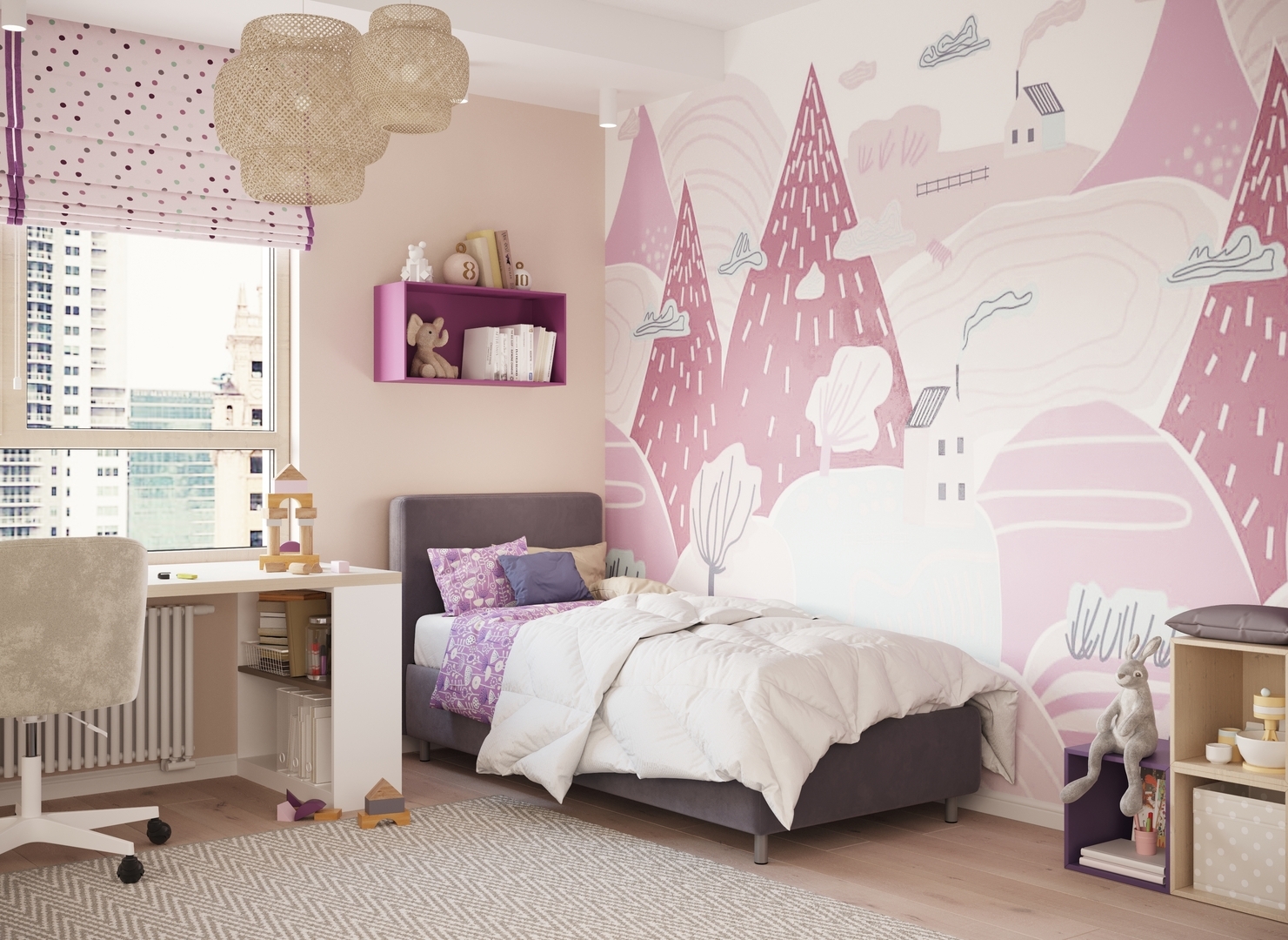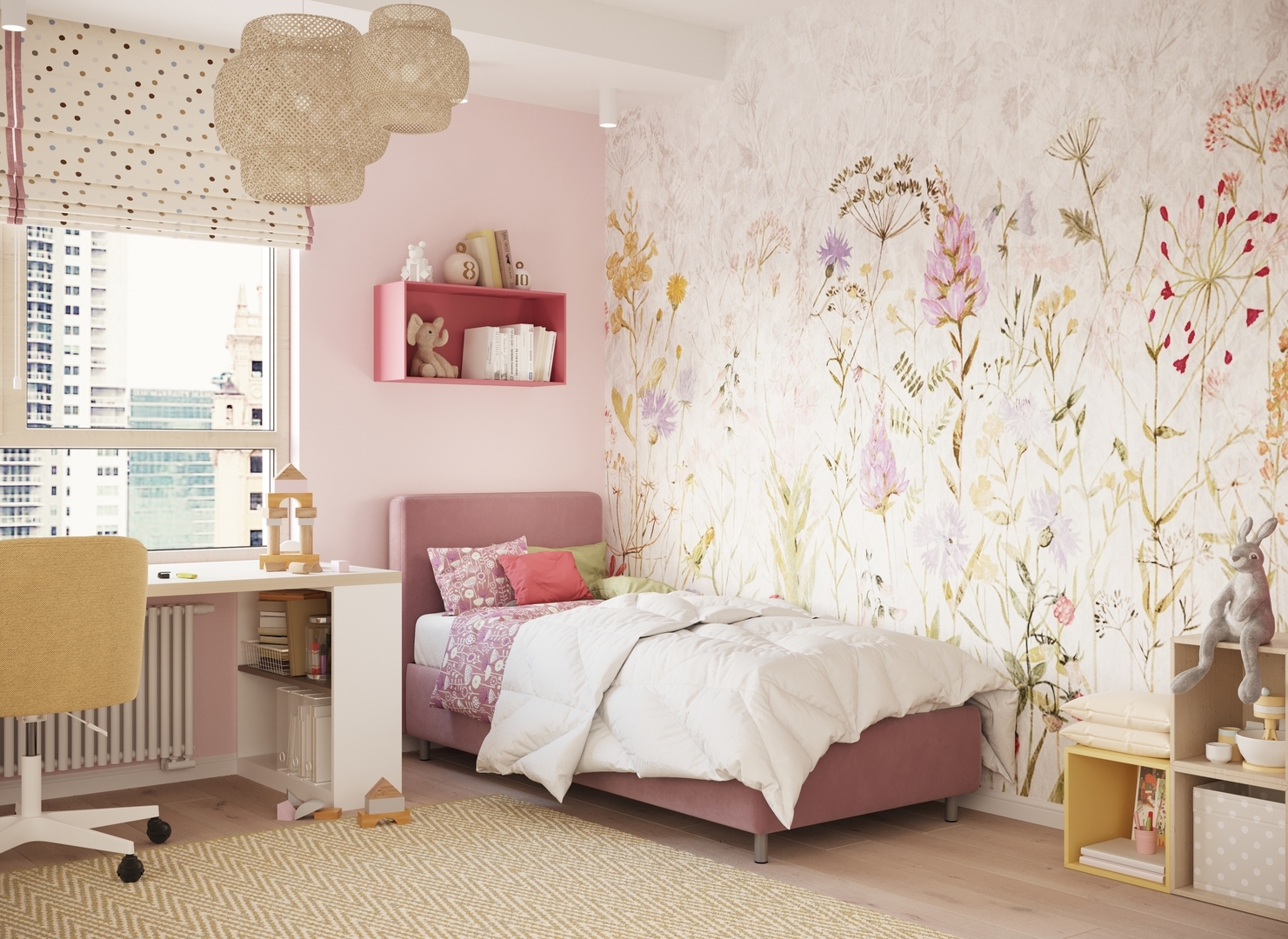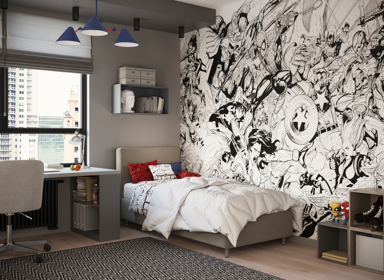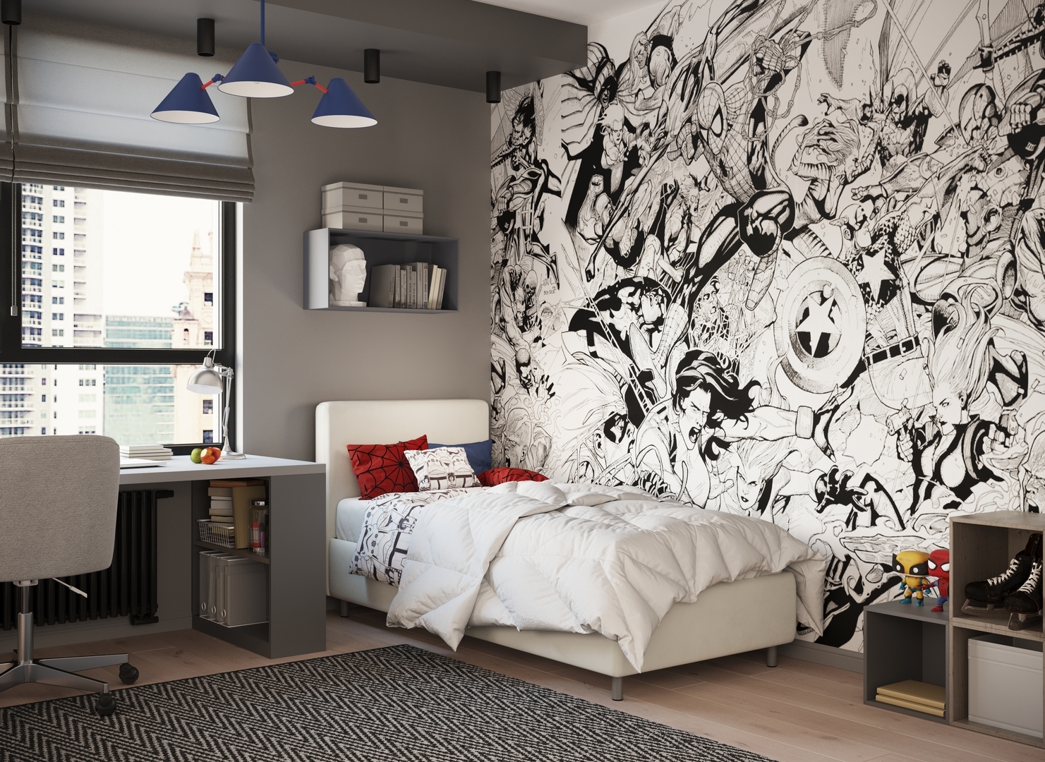 Обратная сторона изголовья выполнена в мебельной ткани и позволяет ставить кровать в центре комнаты для зонирования пространства.