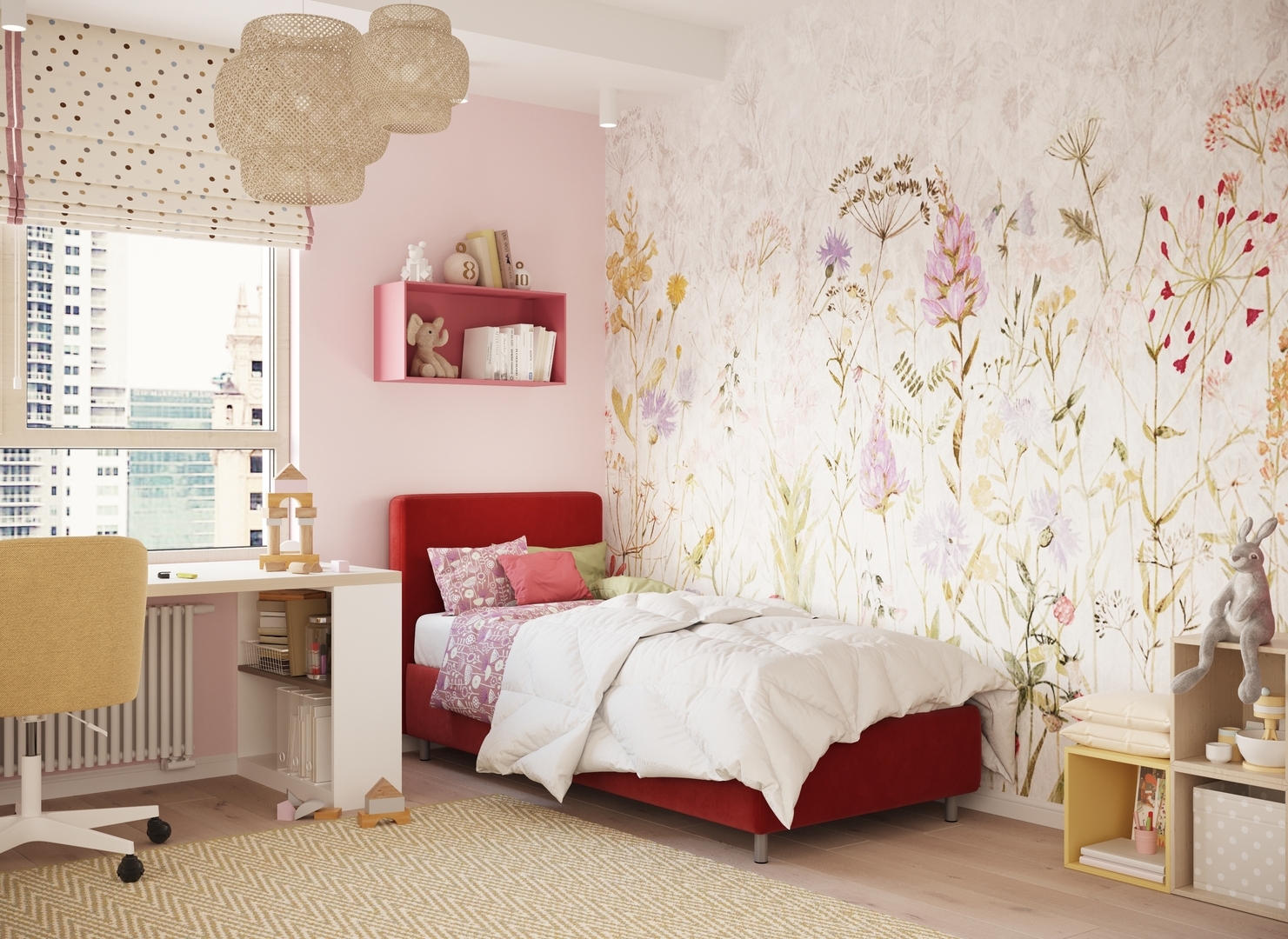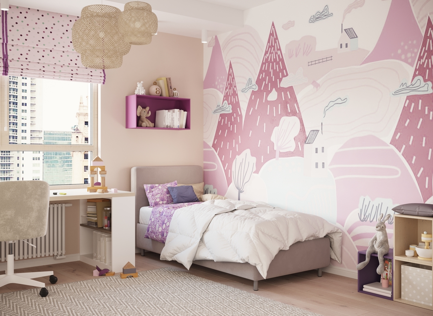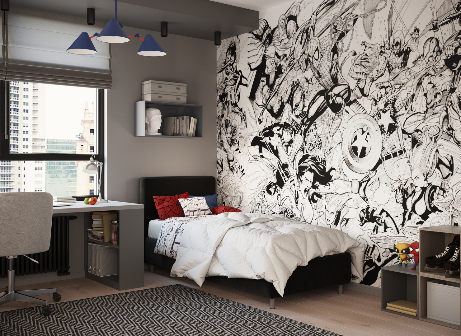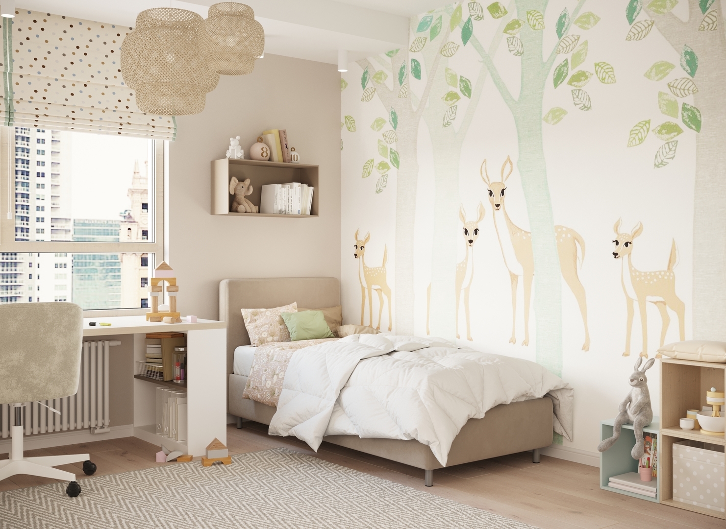 Обратная сторона изголовья выполнена в мебельной ткани и позволяет ставить кровать в центре комнаты для зонирования пространства.
