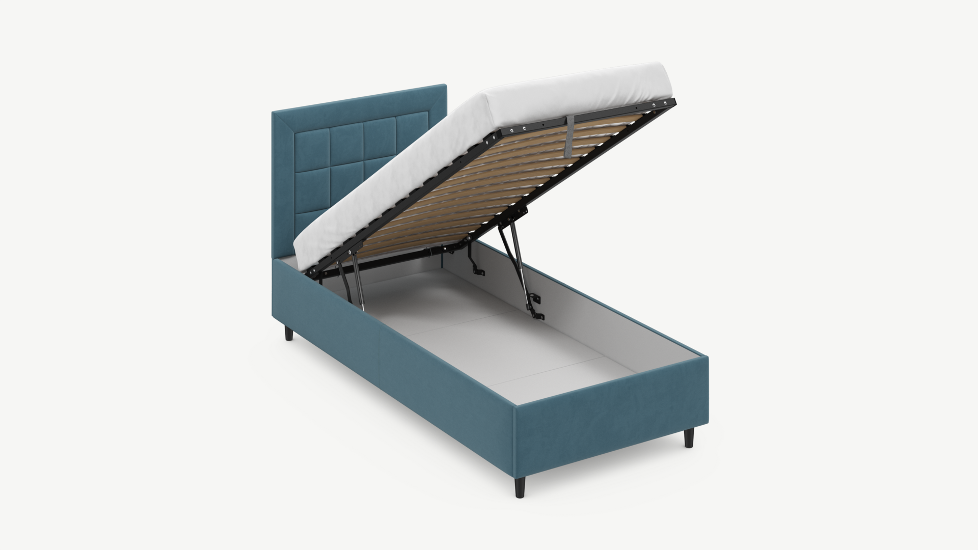 Вместительная емкость под кроватью без внутренних перегородок позволяет использовать для хранения вещей 100% пространства.