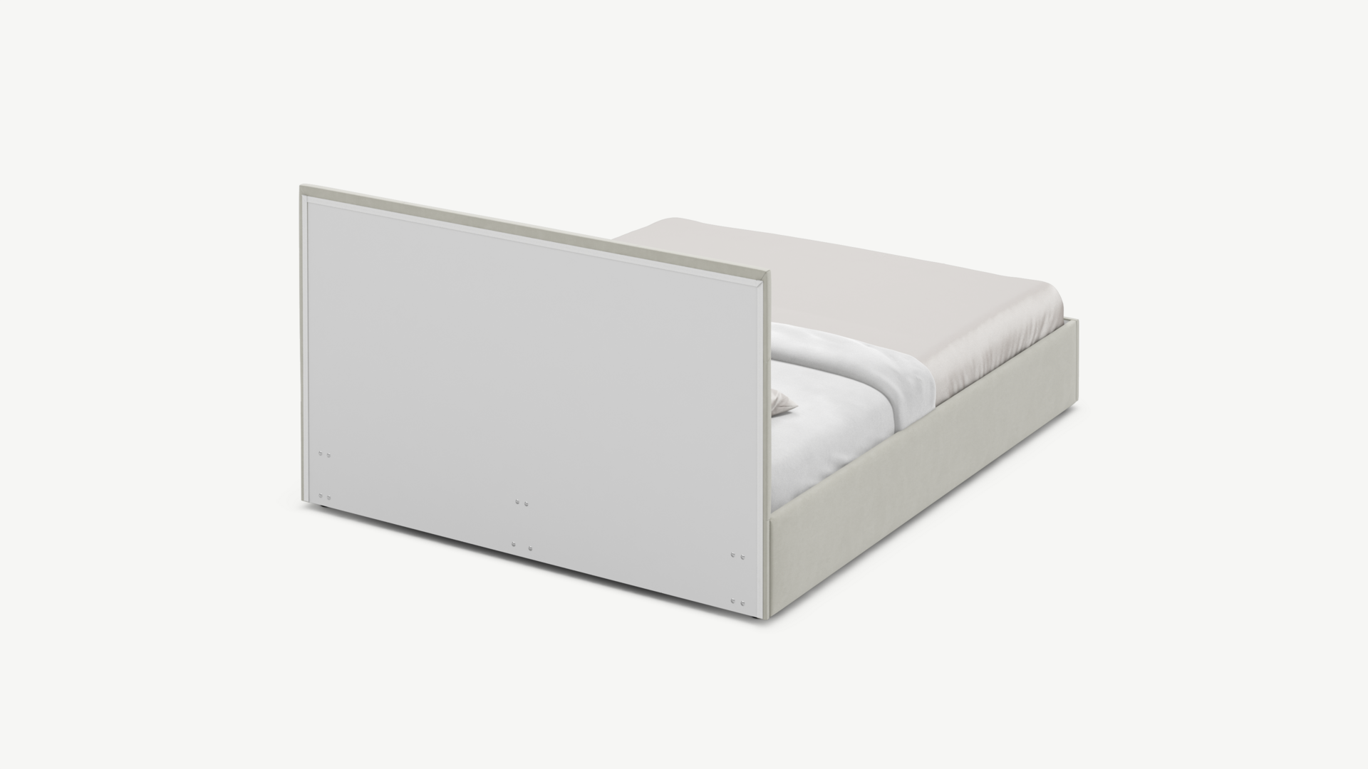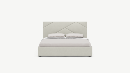MOON FAMILY 1257 привлекает внимание оригинальным исполнением: широкие полосы ткани эффектно пересекают периметр изголовья, создавая на нем графический орнамент. Элегантным и практичным акцентом служат скрытые карманы, расположенные по его углам. Лаконичные формы объемных царг создают единый гармоничный образ и фокусируют внимание на центральном текстурном элементе кровати.