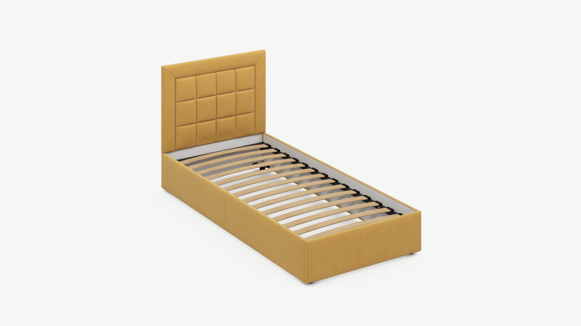 Изголовье декорировано рельефным рисунком стежки в крупный квадрат, получившим особую фактуру за счет глубины шва.