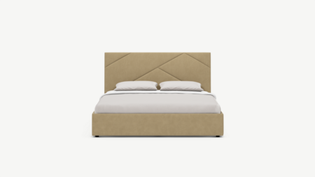 MOON FAMILY 1257 привлекает внимание оригинальным исполнением: широкие полосы ткани эффектно пересекают периметр изголовья, создавая на нем графический орнамент. Элегантным и практичным акцентом служат скрытые карманы, расположенные по его углам. Лаконичные формы объемных царг создают единый гармоничный образ и фокусируют внимание на центральном текстурном элементе кровати.