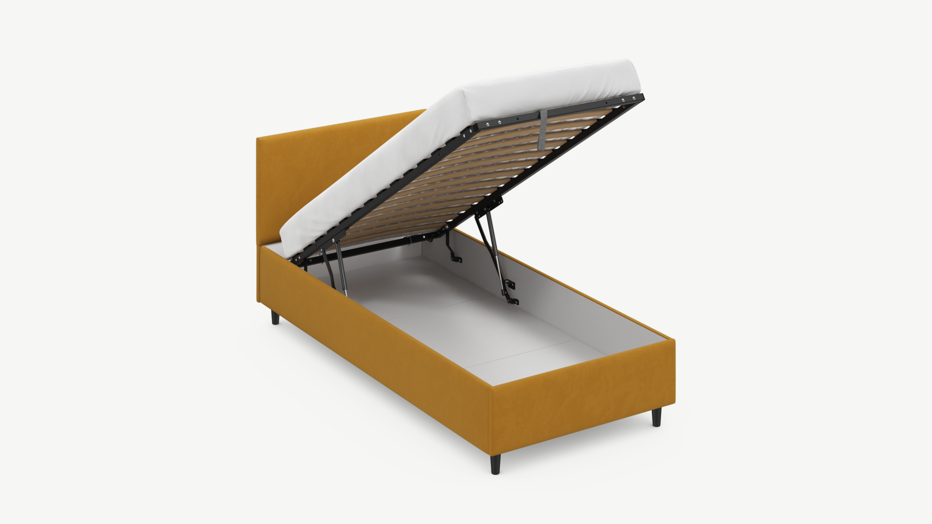 • Скрытая под основанием вместительная емкость без внутренних перегородок позволяет использовать всю площадь подкроватного пространства для хранения вещей.
