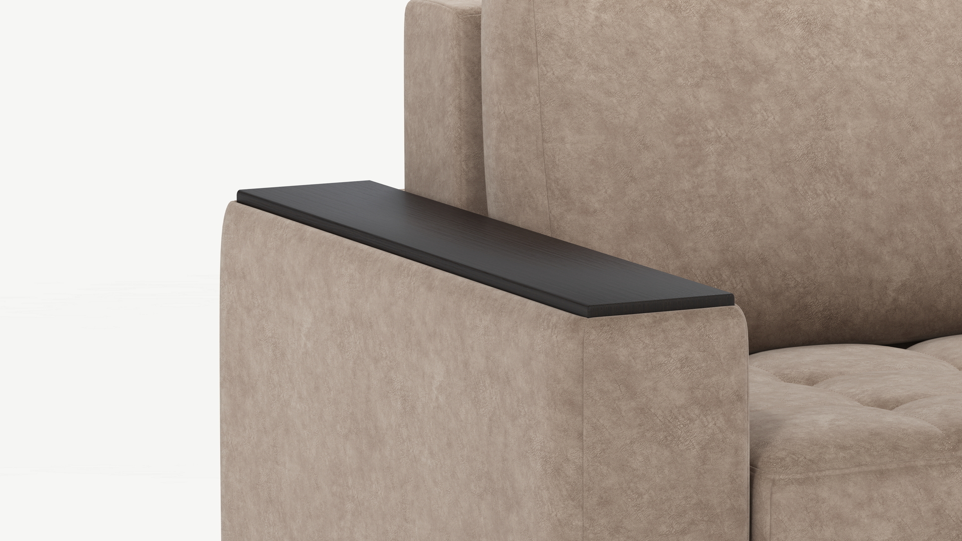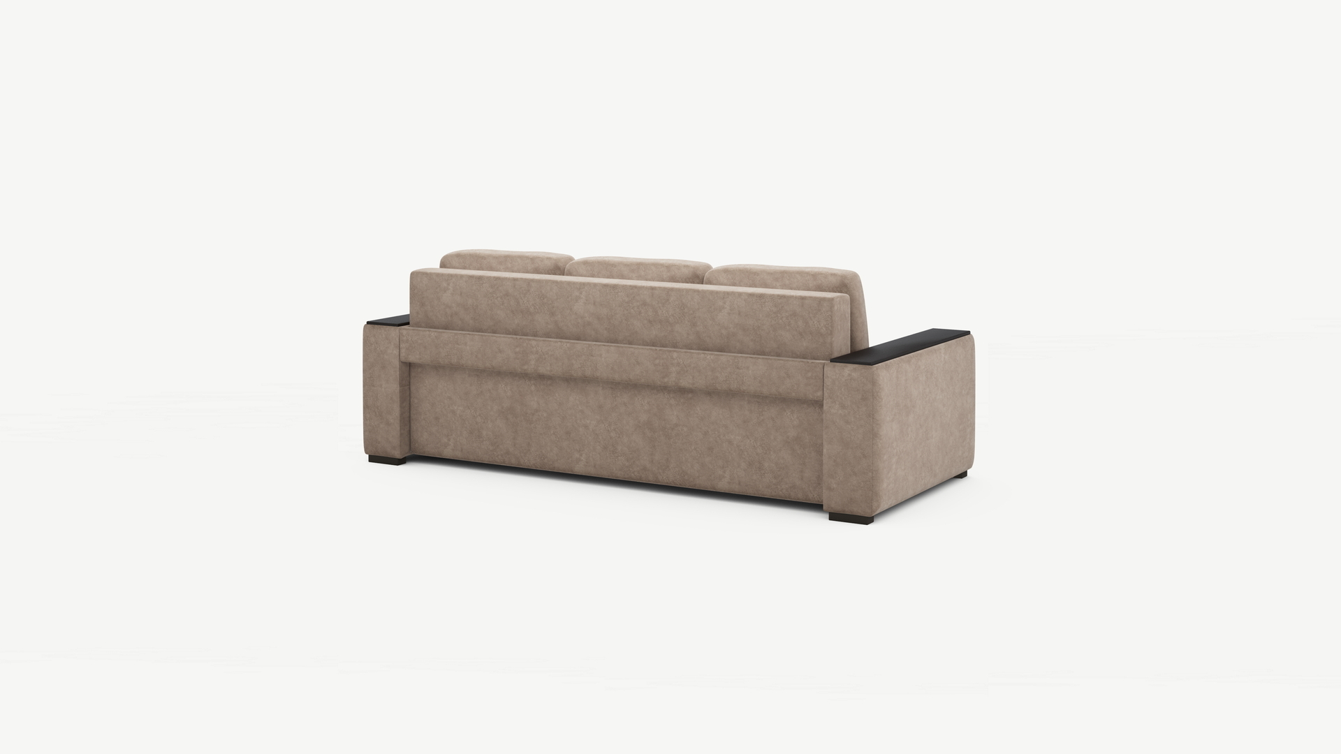 По замыслу дизайнеров, форма подушек удачно поддерживается объемными прямоугольными подлокотниками с широкой столешницей, на которую всегда можно положить книгу и пульт, телефон или планшет, а также поставить чашечку чая.