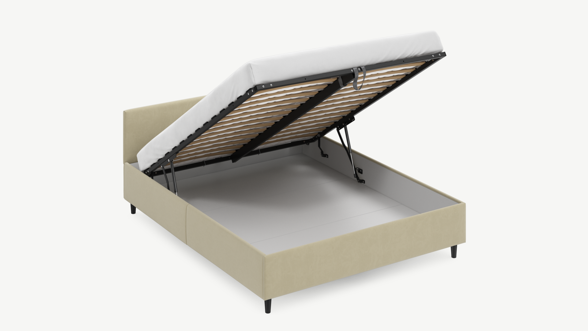 • Скрытая под основанием вместительная емкость без внутренних перегородок позволяет использовать всю площадь подкроватного пространства для хранения вещей.