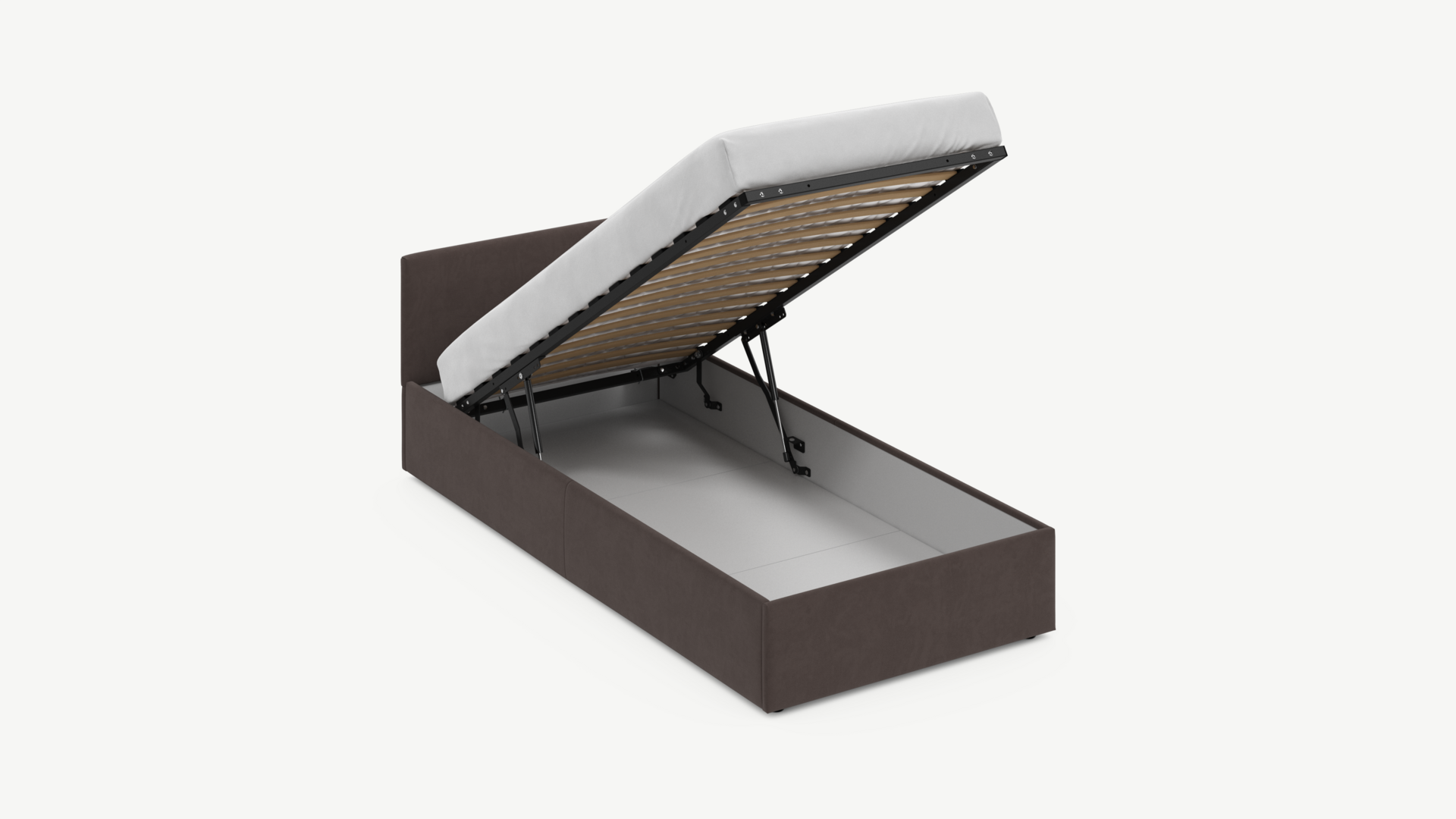 • Скрытая под основанием вместительная емкость без внутренних перегородок позволяет использовать всю площадь подкроватного пространства для хранения вещей.