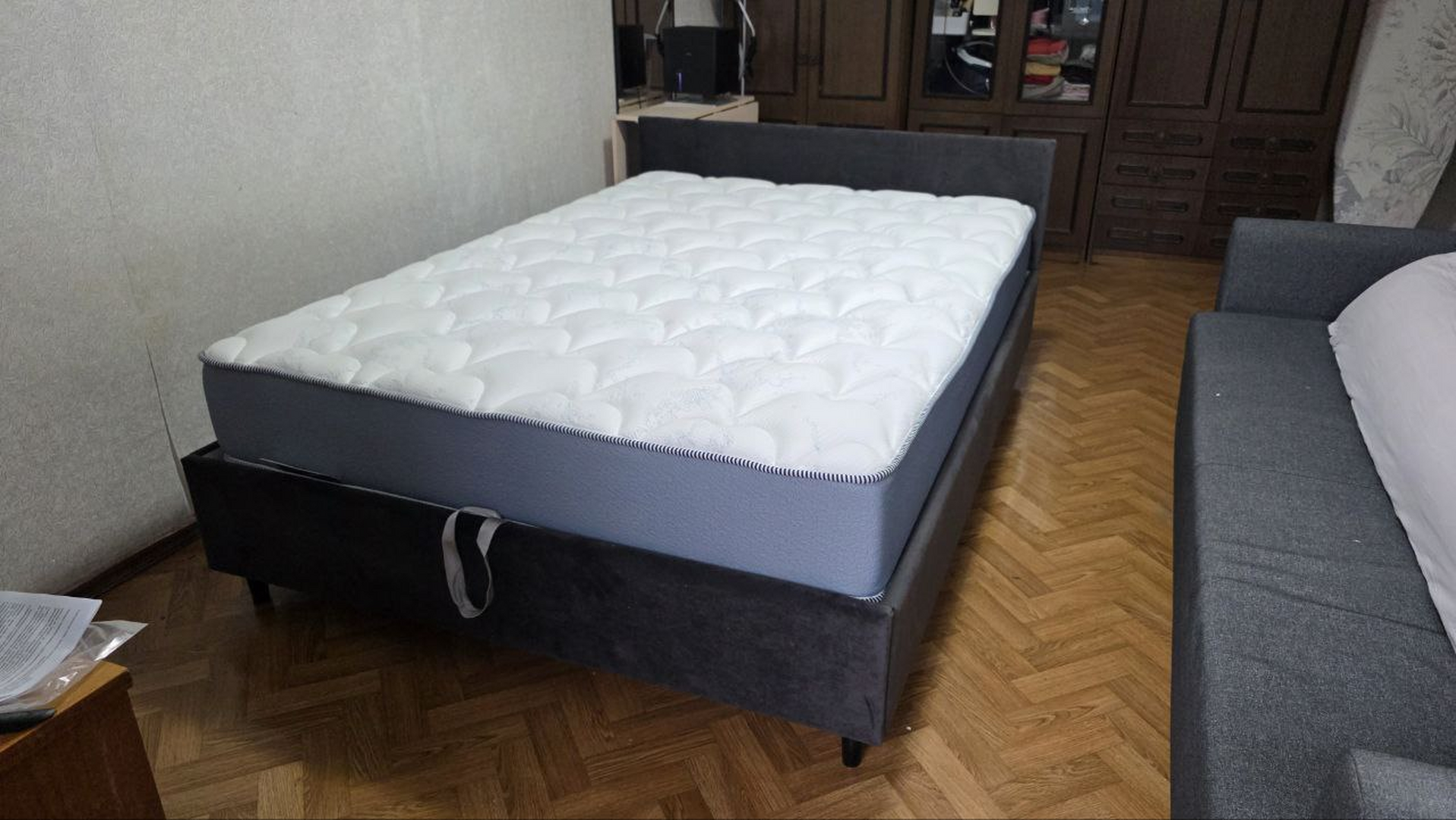 Очень долго выбирала кровать, т.к. необходимо было определенной высоты изголовье, габариты и ящик для хранения. Тут все сошлось. Изначально оформляла доставку через 3 недели, к моменту когда привезут матрас, но оказалось, что матрас привезли через 3 дня, сотрудники компании оперативно назначили доставку на ближайшее время (через два дня). Ребята которые доставляли и собирали кровать очень оперативно ее собрали (я в шоке с их скорости, 30 минут). Заранее уточнили, как и где будет стоять. Все за собой убрали. Кровать отличная. Ткань приятная, пыль не собирает. Механизм работает отлично (матрас с весом в 35,5 кг. спокойно поднимает). Ничего не скрипит и не люфтит. Спокойно вдвоем спим (=150 кг.). Ящики крепкие и вместительные. Сделано все качественно, даже не ожидала. Робот пылесос спокойно проходит (dreame L40s ultra). Жалко, что нет выбора, сделать сзади изголовья тоже микровелюром. Огромное спасибо сотрудникам компании и доставщикам/сборщикам.
