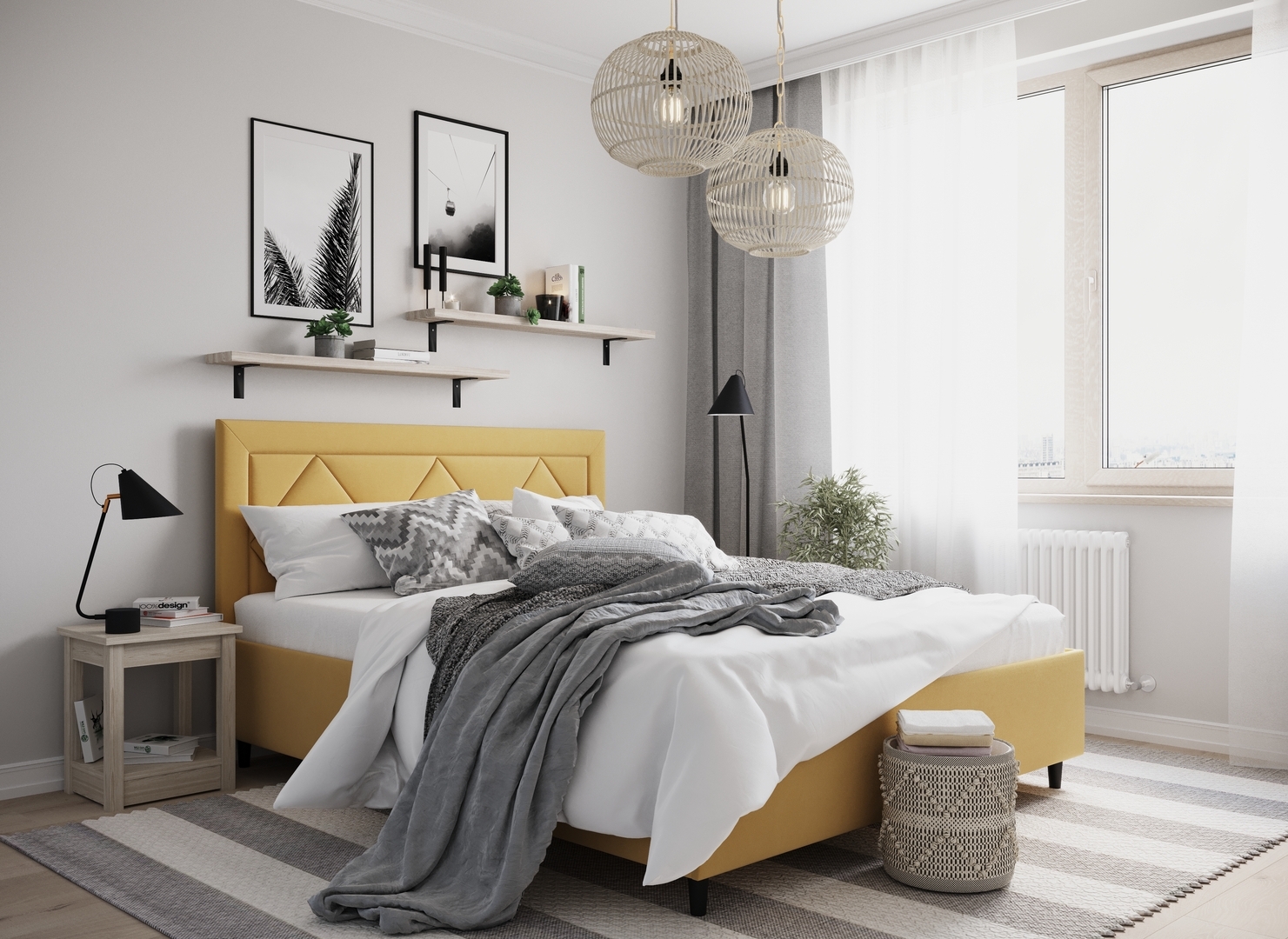 Создать гармоничный интерьер и завершить образ спальни помогут дополнительные аксессуары, например: тумбы, банкетки, подушки.