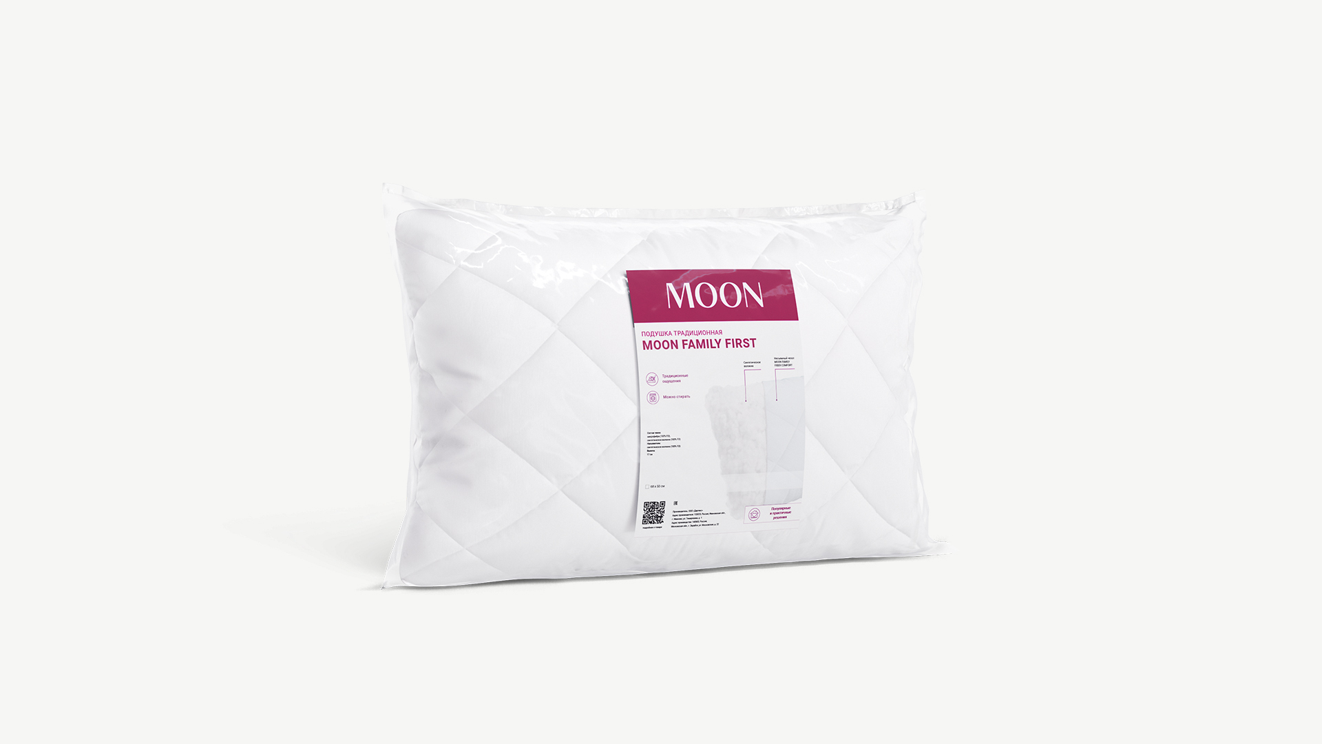 Подушка традиционнаяMOON FAMILY FIRST — традиционная подушка, изготовленная из современных материалов. Отличное базовое решение для тех, кто ценит сон на классических набивных подушках и ищет практичный вариант для себя, своей семьи и гостей, остающихся на ночь.