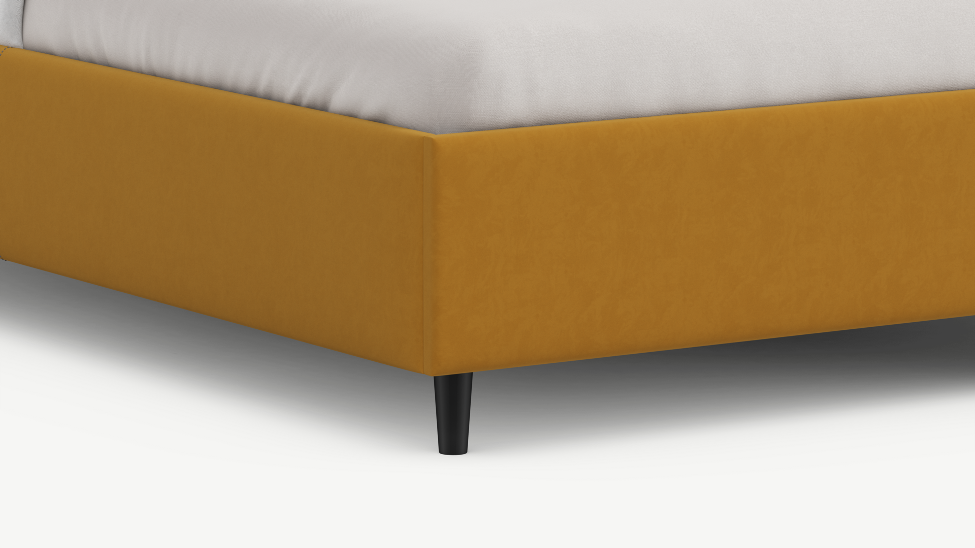 Царга, задающая пропорции, благодаря гладкости своей фактуры подчеркивает центральный элемент декора. Высокие опоры приподнимают фигуру кровати над полом и добавляют её образу визуальной легкости.