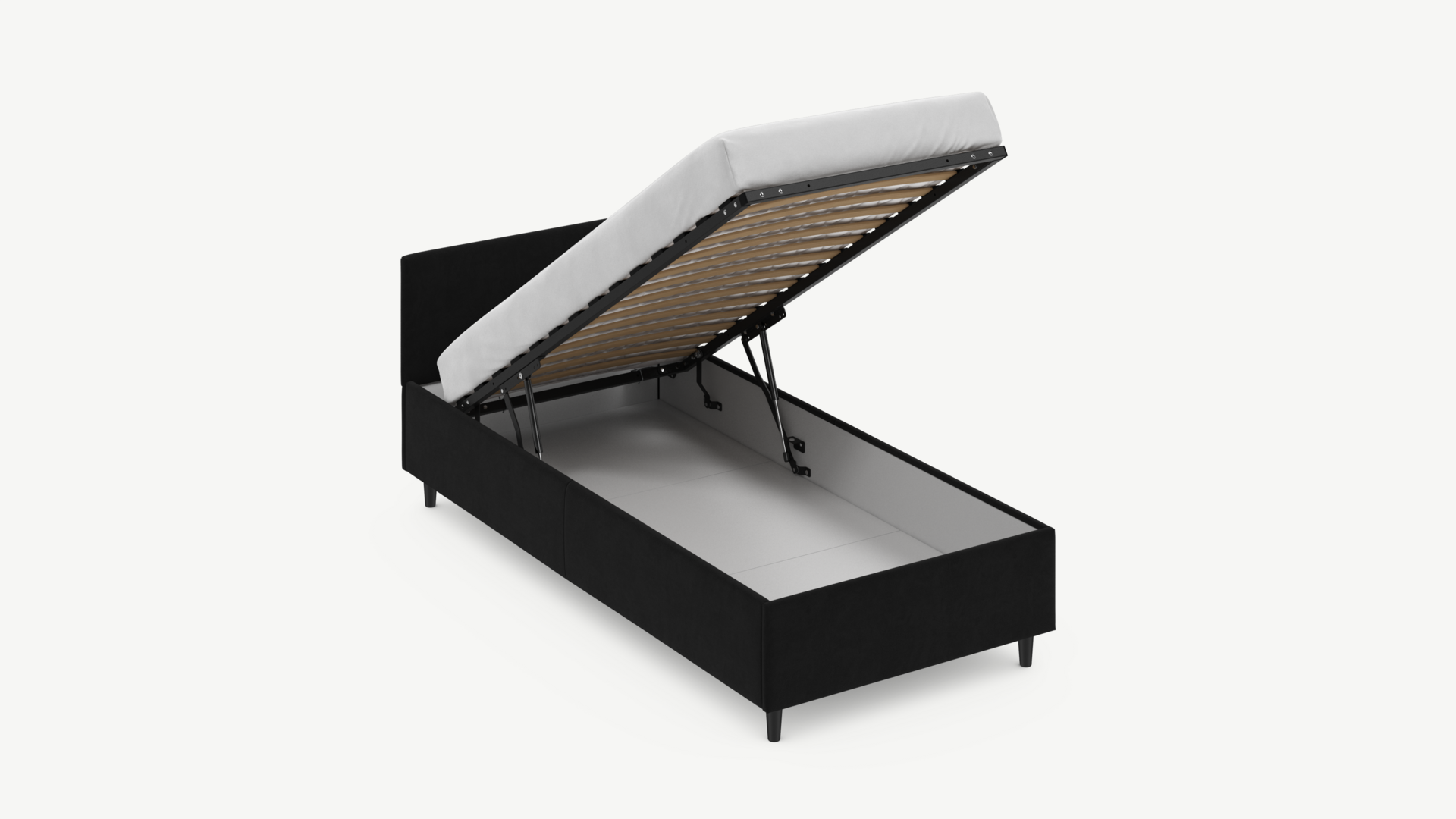 Вместительная емкость под кроватью без внутренних перегородок позволяет использовать для хранения вещей 100% пространства.