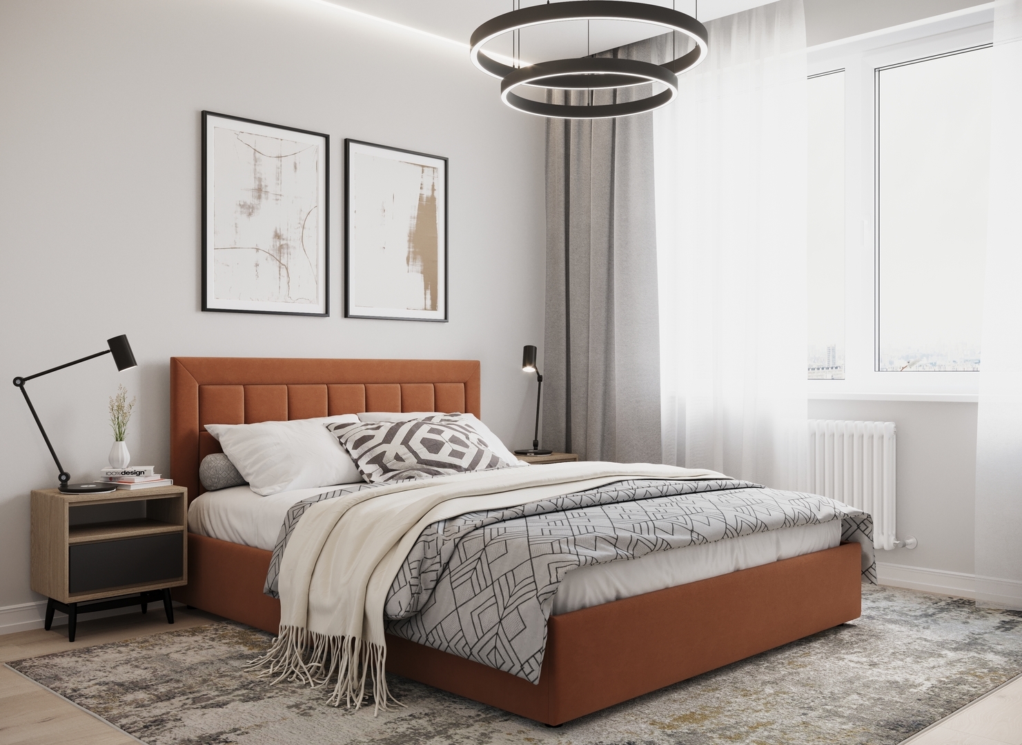 Создать гармоничный интерьер и завершить образ спальни помогут дополнительные аксессуары, например: тумбы, банкетки, подушки.