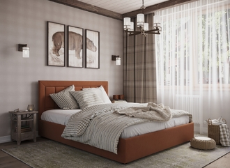 Стежка помещена в центр изголовья и обрамлена, словно картина. Объемные царги становятся гармоничным дополнением образа и завершают цельную фигуру кровати.
