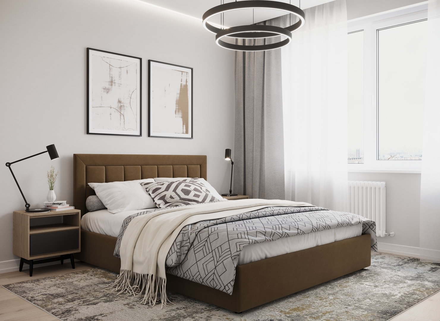 Создать гармоничный интерьер и завершить образ спальни помогут дополнительные аксессуары, например: тумбы, банкетки, подушки.