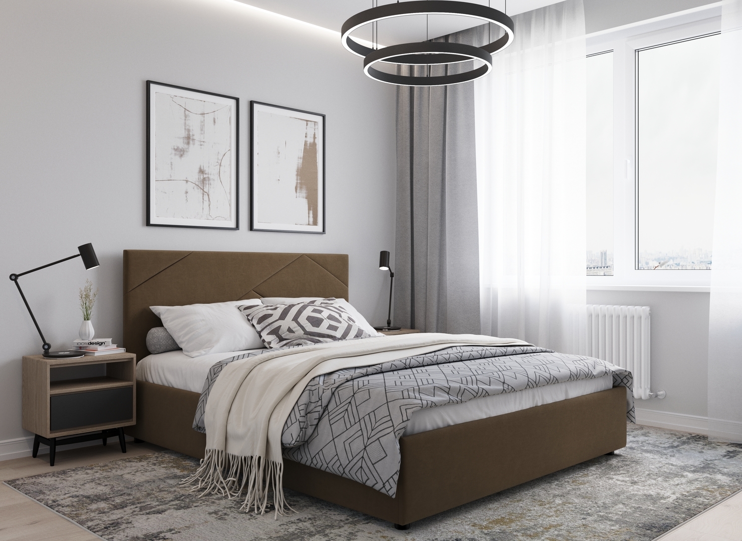 MOON FAMILY 1257 привлекает внимание оригинальным исполнением: широкие полосы ткани эффектно пересекают периметр изголовья, создавая на нем графический орнамент. Элегантным и практичным акцентом служат скрытые карманы, расположенные по его углам. Лаконичные формы объемных царг создают единый гармоничный образ и фокусируют внимание на центральном текстурном элементе кровати.
