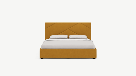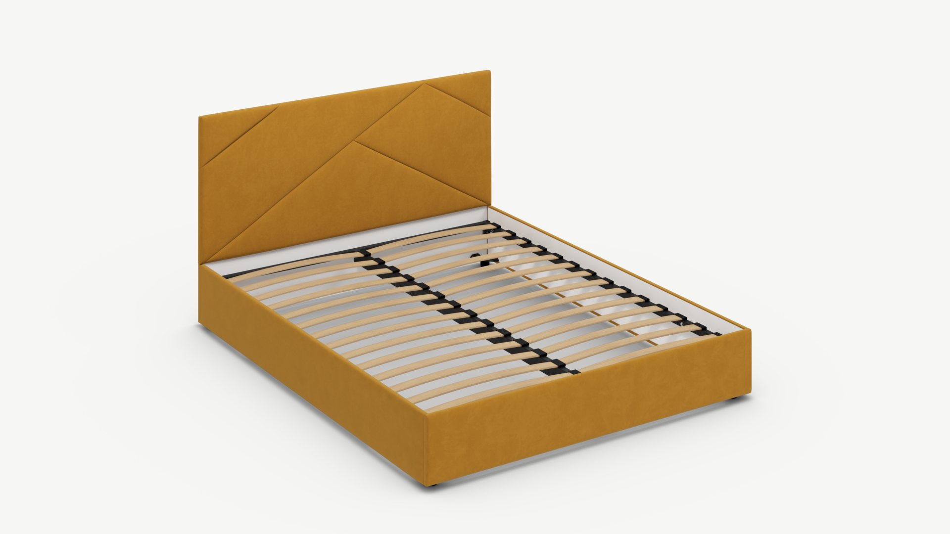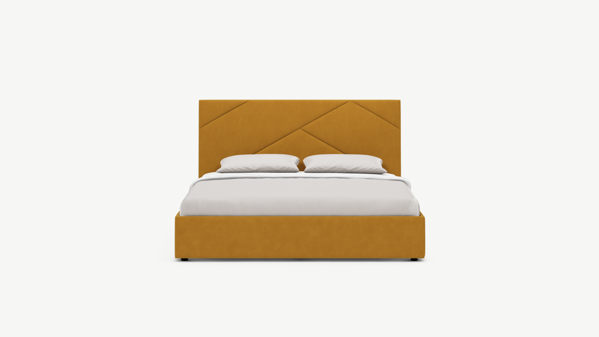 MOON FAMILY 1257 привлекает внимание оригинальным исполнением: широкие полосы ткани эффектно пересекают периметр изголовья, создавая на нем графический орнамент. Элегантным и практичным акцентом служат скрытые карманы, расположенные по его углам. Лаконичные формы объемных царг создают единый гармоничный образ и фокусируют внимание на центральном текстурном элементе кровати.