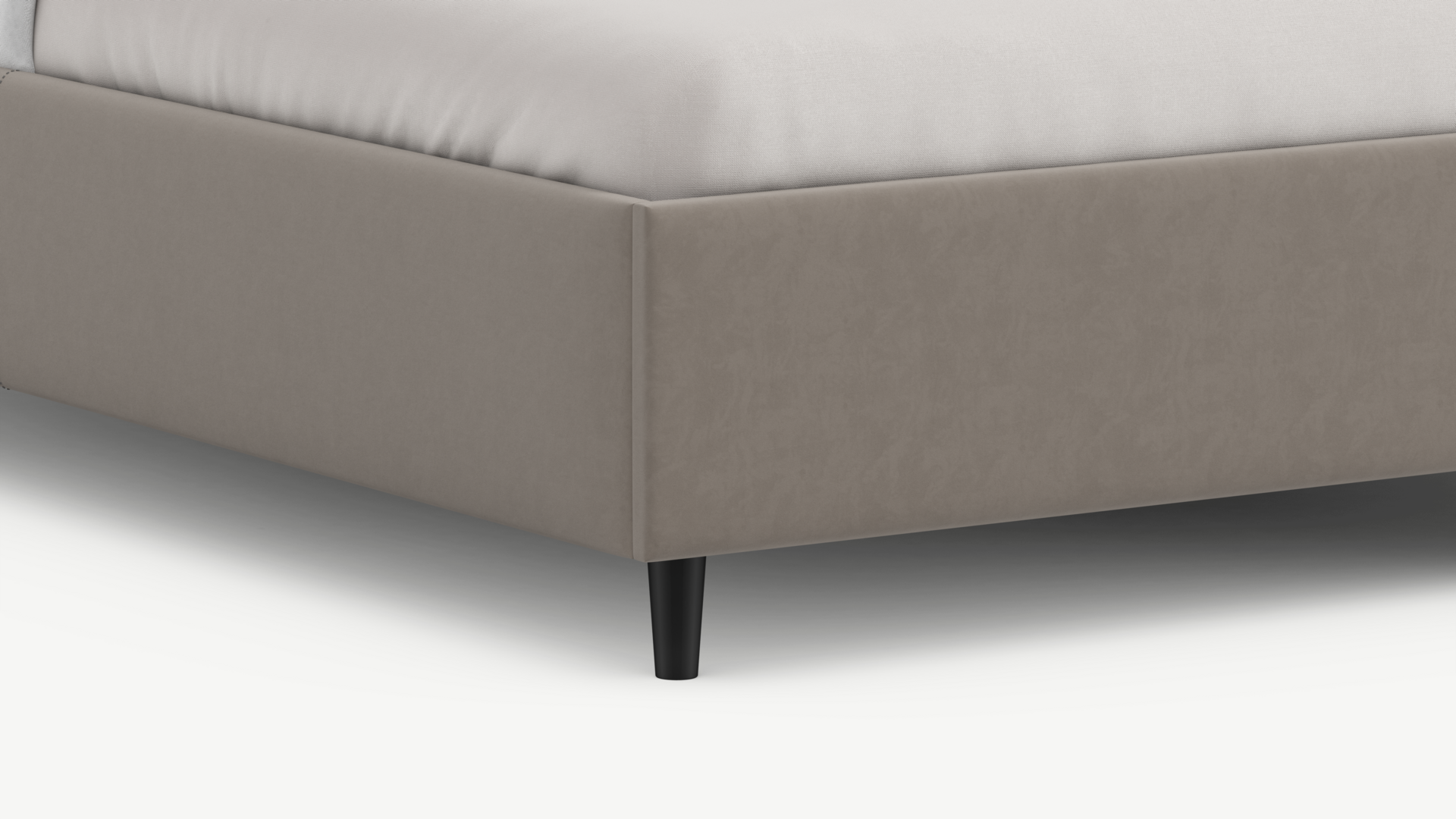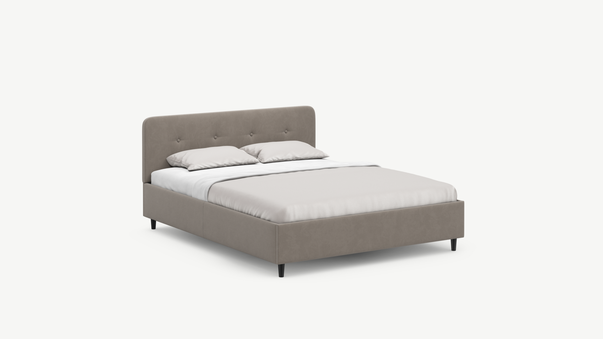 Царга, задающая пропорции, благодаря гладкости своей фактуры подчеркивает центральный элемент декора. Высокие опоры приподнимают фигуру кровати над полом и добавляют её образу визуальной легкости.
