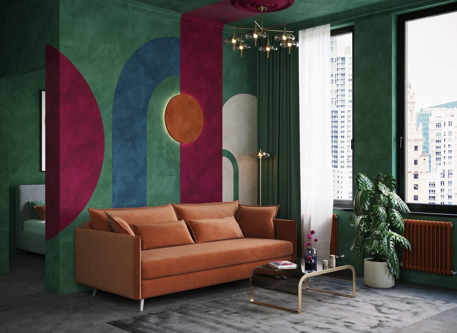 Спинка, выполненная в обивочной ткани, позволяет использовать диван для зонирования пространства.