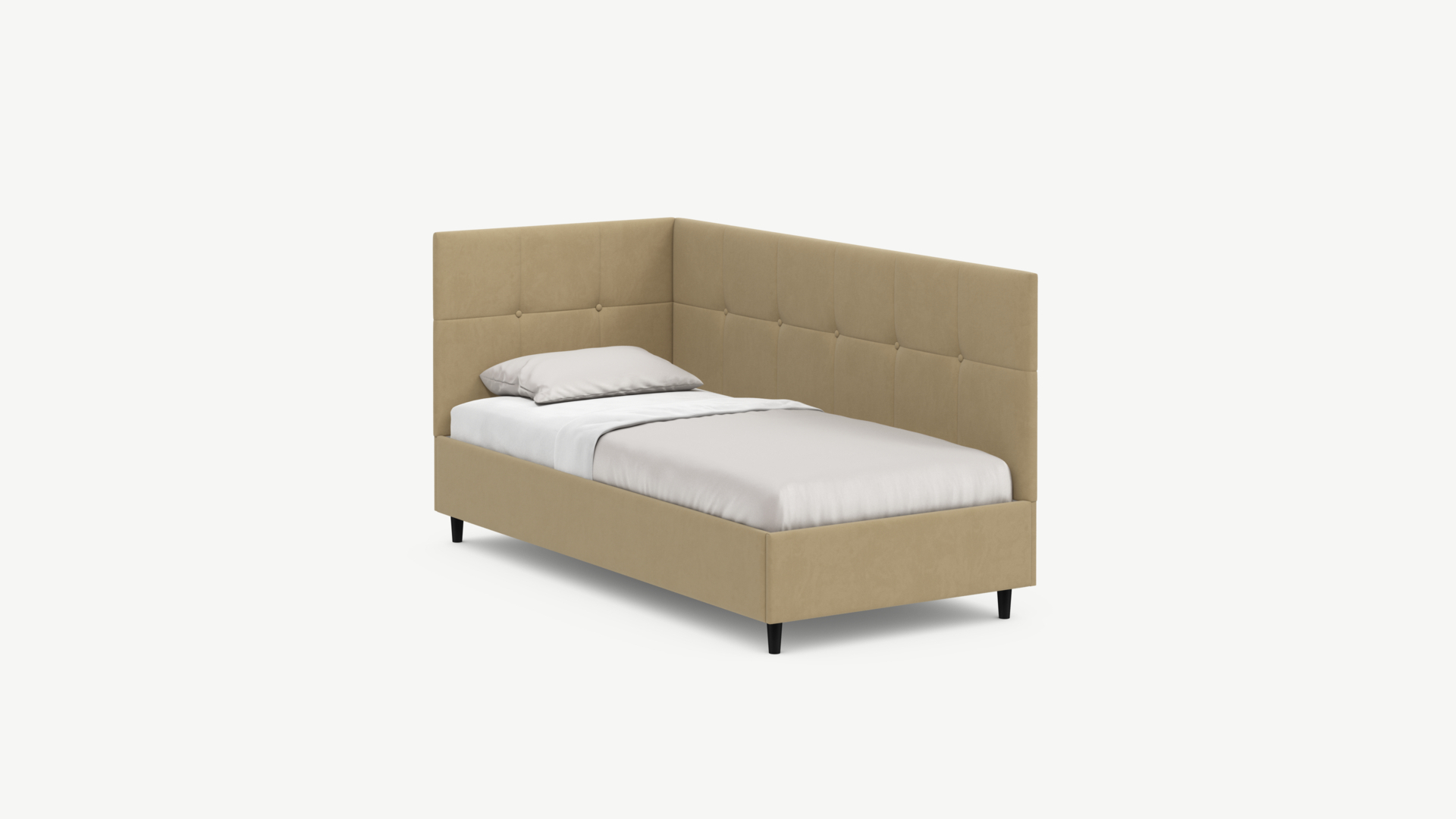 Угловая односпальная кровать MOON FAMILY 1261 с мягкой спинкой и изголовьем создаст в Вашей спальне ощущение уюта. Крупная квадратная стежка привносит в интерьер графических акцентов, а вставка из пуговиц наполняет пространство ощущением домашнего тепла.