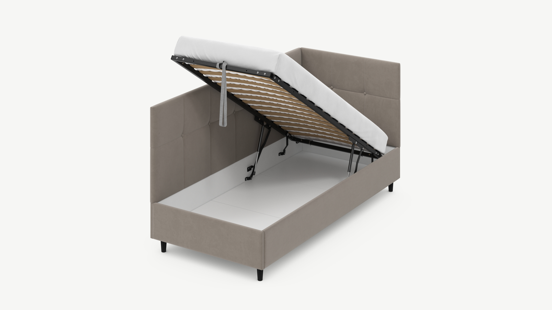 Угловая односпальная кровать MOON FAMILY 1261 с мягкой спинкой и изголовьем создаст в Вашей спальне ощущение уюта. Крупная квадратная стежка привносит в интерьер графических акцентов, а вставка из пуговиц наполняет пространство ощущением домашнего тепла.
