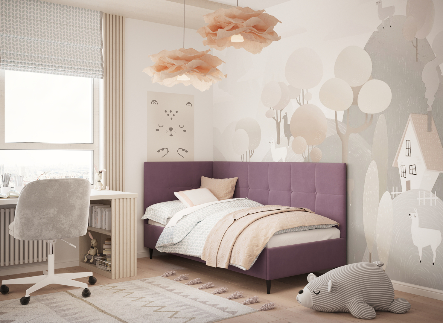 Угловая односпальная кровать MOON FAMILY 1261 с мягкой спинкой и изголовьем создаст в Вашей спальне ощущение уюта. Крупная квадратная стежка привносит в интерьер графических акцентов, а вставка из пуговиц наполняет пространство ощущением домашнего тепла.