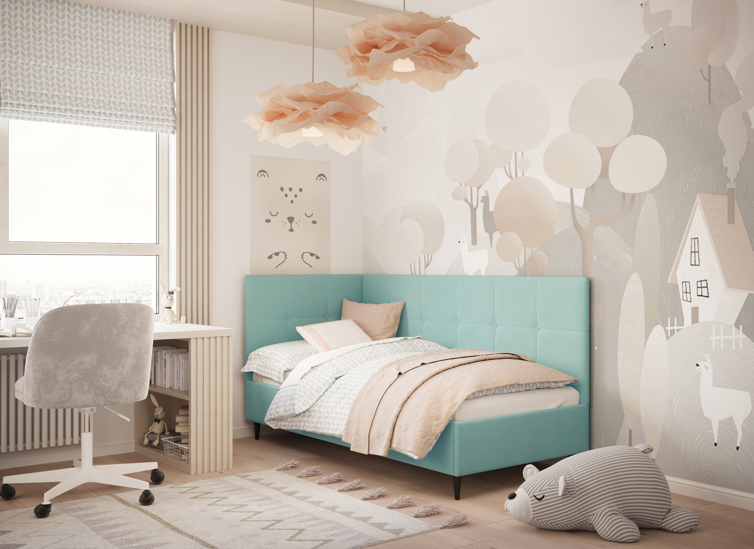 MOON FAMILY 1261 объединяет функциональность и стиль, создавая гармоничное пространство для отдыха и творчества. Кровать доступна в левостороннем и правостороннем исполнении, что позволяет легко адаптировать ее под любые интерьерные особенности.