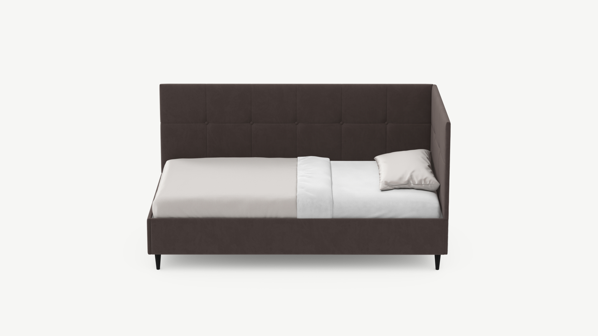 Угловая односпальная кровать MOON FAMILY 1261 с мягкой спинкой и изголовьем создаст в Вашей спальне ощущение уюта. Крупная квадратная стежка привносит в интерьер графических акцентов, а вставка из пуговиц наполняет пространство ощущением домашнего тепла.
