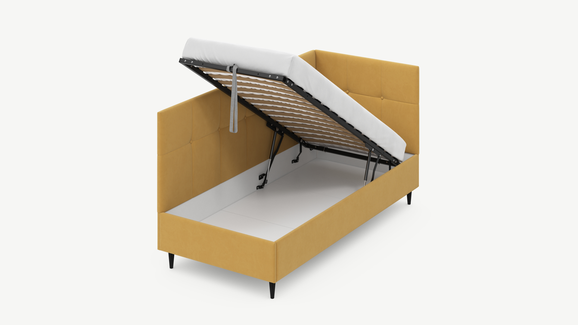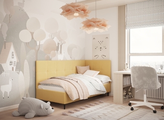 Угловая односпальная кровать MOON FAMILY 1261 с мягкой спинкой и изголовьем создаст в Вашей спальне ощущение уюта. Крупная квадратная стежка привносит в интерьер графических акцентов, а вставка из пуговиц наполняет пространство ощущением домашнего тепла.
