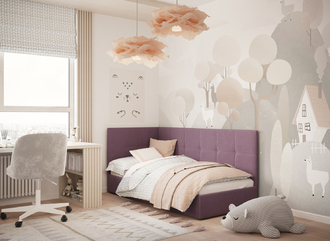 Угловая односпальная кровать MOON FAMILY 1261 с мягкой спинкой и изголовьем создаст в Вашей спальне ощущение уюта. Крупная квадратная стежка привносит в интерьер графических акцентов, а вставка из пуговиц наполняет пространство ощущением домашнего тепла.