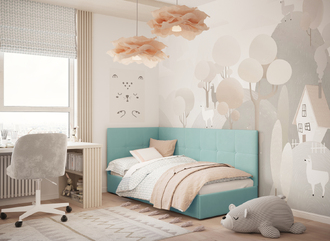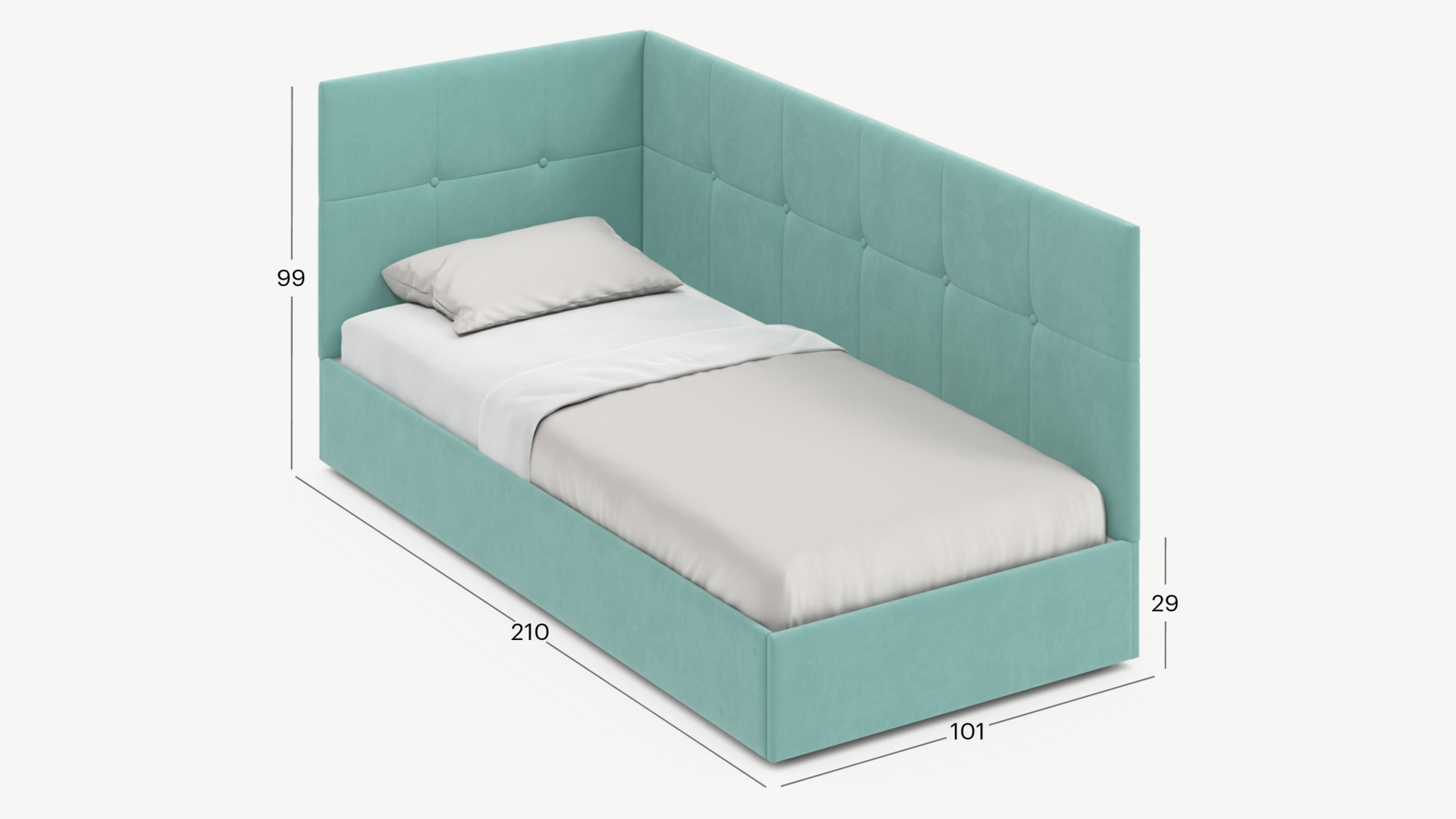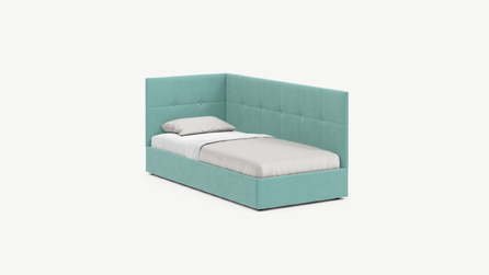 Угловая односпальная кровать MOON FAMILY 1261 с мягкой спинкой и изголовьем создаст в Вашей спальне ощущение уюта. Крупная квадратная стежка привносит в интерьер графических акцентов, а вставка из пуговиц наполняет пространство ощущением домашнего тепла.