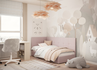 Угловая односпальная кровать MOON FAMILY 1261 с мягкой спинкой и изголовьем создаст в Вашей спальне ощущение уюта. Крупная квадратная стежка привносит в интерьер графических акцентов, а вставка из пуговиц наполняет пространство ощущением домашнего тепла.