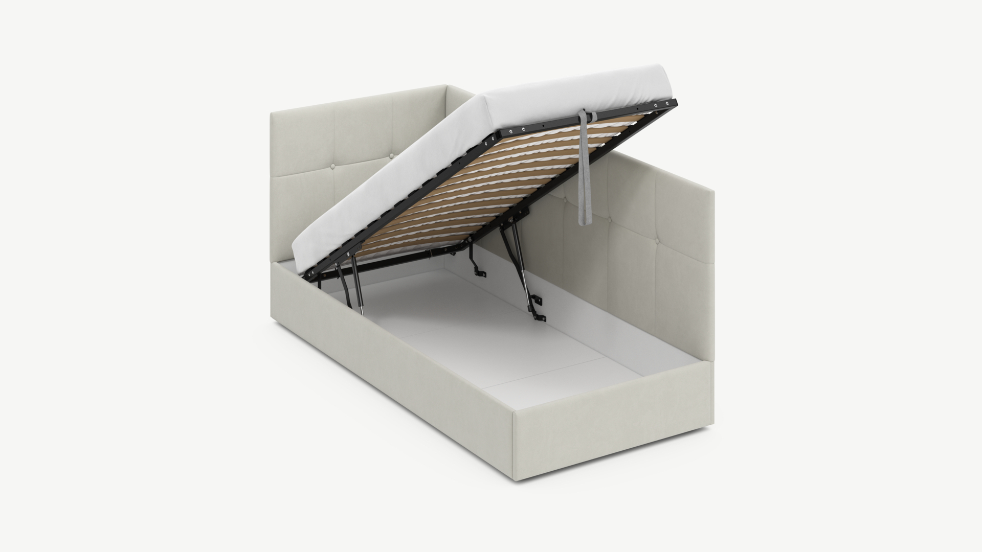 Угловая односпальная кровать MOON FAMILY 1261 с мягкой спинкой и изголовьем создаст в Вашей спальне ощущение уюта. Крупная квадратная стежка привносит в интерьер графических акцентов, а вставка из пуговиц наполняет пространство ощущением домашнего тепла.