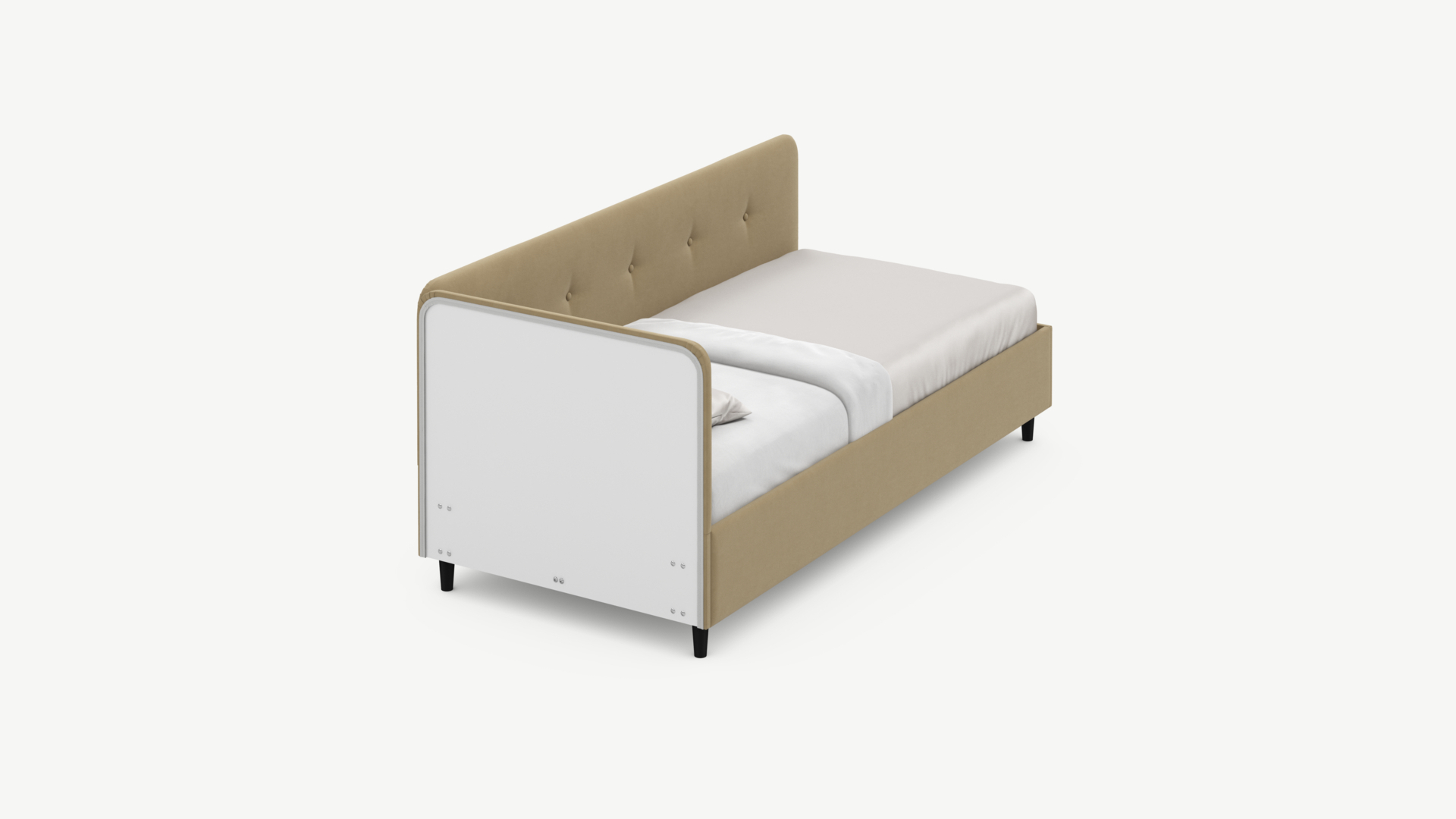 Угловая односпальная кровать MOON FAMILY 1253 с мягкой спинкой и изголовьем обладает округлыми формами, привносящими в интерьер нотки нежности. Изголовье, украшенное пуговицами, добавляет окружающему пространству шарм и уют. Высокие опоры придают кровати визуальной легкости, а также обеспечивают удобство во время уборки.