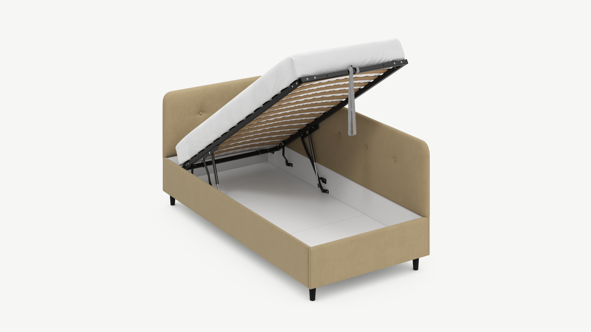 • Скрытая под основанием вместительная емкость без внутренних перегородок позволяет использовать всю площадь подкроватного пространства для хранения вещей.