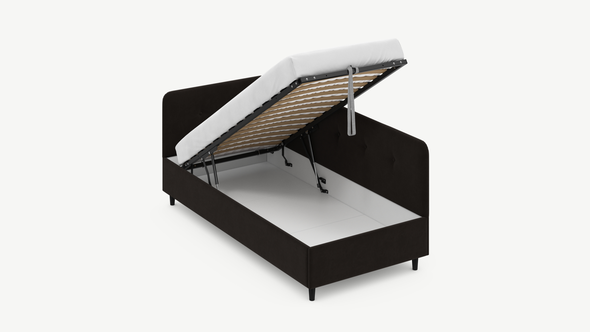 • Скрытая под основанием вместительная емкость без внутренних перегородок позволяет использовать всю площадь подкроватного пространства для хранения вещей.