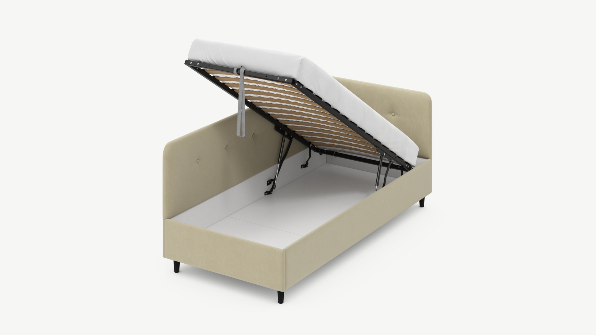 • Скрытая под основанием вместительная емкость без внутренних перегородок позволяет использовать всю площадь подкроватного пространства для хранения вещей.