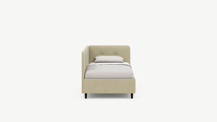 Угловая односпальная кровать MOON FAMILY 1253 с мягкой спинкой и изголовьем обладает округлыми формами, привносящими в интерьер нотки нежности. Изголовье, украшенное пуговицами, добавляет окружающему пространству шарм и уют. Высокие опоры придают кровати визуальной легкости, а также обеспечивают удобство во время уборки.