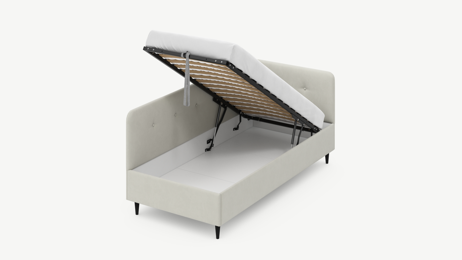 • Скрытая под основанием вместительная емкость без внутренних перегородок позволяет использовать всю площадь подкроватного пространства для хранения вещей.