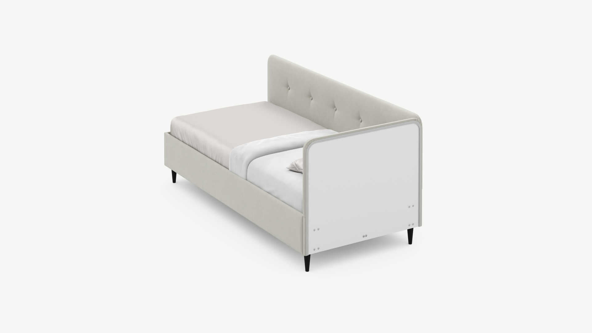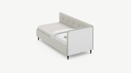 Угловая односпальная кровать MOON FAMILY 1253 с мягкой спинкой и изголовьем обладает округлыми формами, привносящими в интерьер нотки нежности. Изголовье, украшенное пуговицами, добавляет окружающему пространству шарм и уют. Высокие опоры придают кровати визуальной легкости, а также обеспечивают удобство во время уборки.