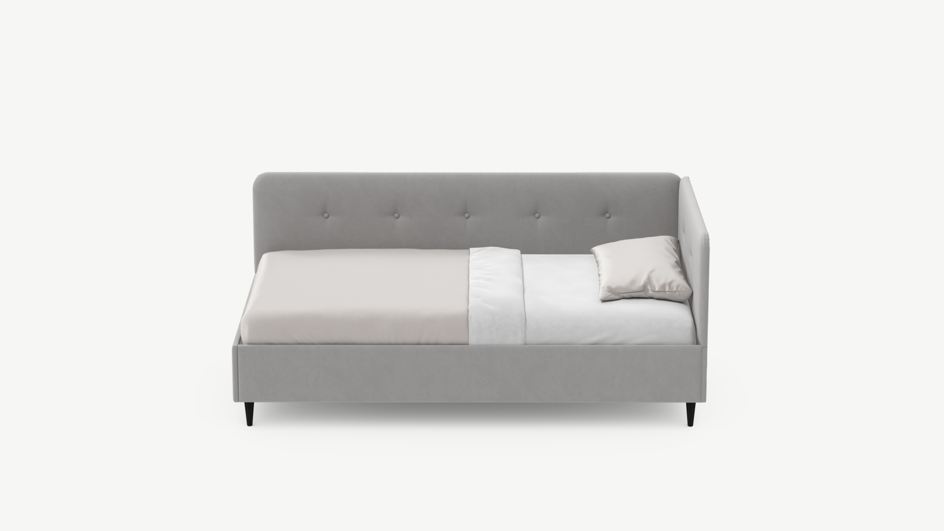 Угловая односпальная кровать MOON FAMILY 1253 с мягкой спинкой и изголовьем обладает округлыми формами, привносящими в интерьер нотки нежности. Изголовье, украшенное пуговицами, добавляет окружающему пространству шарм и уют. Высокие опоры придают кровати визуальной легкости, а также обеспечивают удобство во время уборки.