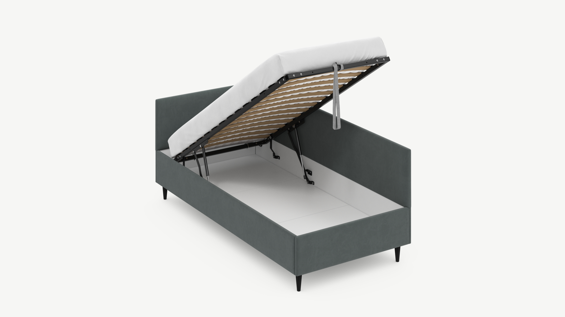• Скрытая под основанием вместительная емкость без внутренних перегородок позволяет использовать всю площадь подкроватного пространства для хранения вещей.
